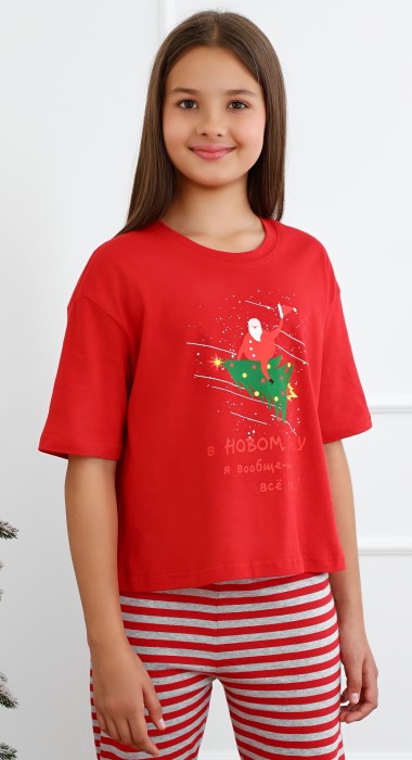 Футболка детская из гладкокрашеного трикотажного полотна "кулирка", модного силуэта, слегка укороченная, свободного покроя, с приспущенным плечом, втачными рукавами длиной до локтя, горловиной овальной формы, обработанной втачной планкой и принтом в центре переда. По шву втачивания планки настрочена отделочная строчка. Низ изделия и нижние срезы рукавов обработаны швом вподгибку.