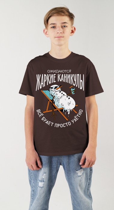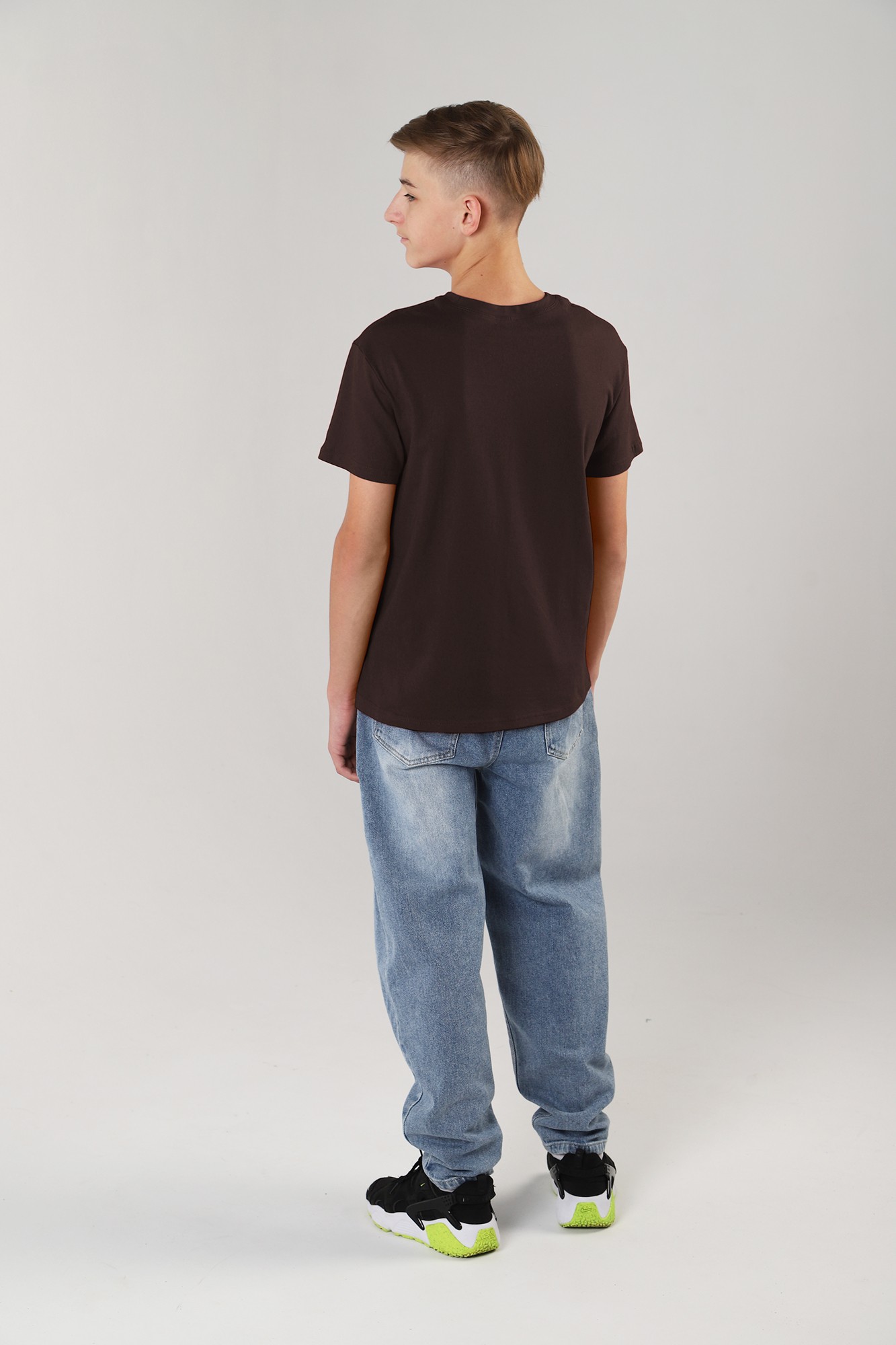 Футболка для мальчика классического покроя: с короткими втачными рукавами, горловиной овальной формы, обработанной втачной планкой, и принтом в центре переда, выполненным в технике шелкографии. По шву втачивания планки в горловину настрочена отделочная строчка на двухигольной машине. неижние срезы рукавов и изделия обработаны подгибкой.