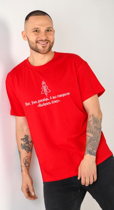 Футболка мужская с короткими рукавами, удлиненными плечевыми швами, горловиной овальной формы, обработанной втачной планкой и принтом на детали переда, выполненным в технике шелкографии. По шву втачивания планки в горловину настрочена отделочная строчка. Нижние срезы руквов и изделия обработаны швом вподгибку.