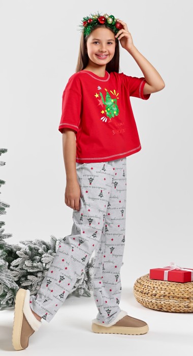 Костюм для девочки из трикотажного полотна "кулирка" в комбинации двух видов: гладкокрашенного красного цвета и с набивным тематическим рисунком на сером фоне , состоящий из футболки и брюк. Футболка - модного силуэта, слегка укороченная свободного покроя, с приспущенным плечом, с втачными рукавами длиной до локтя, горловиной овальной формы, обработанной втачной планкой и принтом в центре переда. По шву втачивани я планки настрочена декоративная (5-ниточная) отделочная строчка нитками контрастного цвета Подгибка низа рукавов и изделия так же выполнена с применением декоративной отделочной строчки. Брюки выполнены из полотна с набивным темкатическим рисунком, длинные, умеренной ширины, прямые, с эластичной тесьмой по талии.