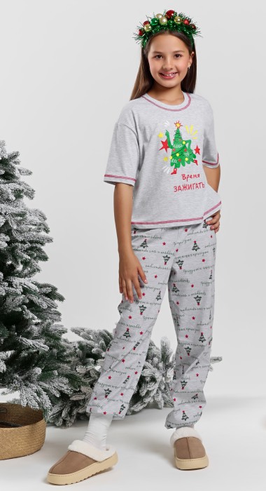 Костюм для девочки из трикотажного полотна в комбинации двух видов: полотна "кулирка-кармеланж" и полотна "кулирка"с набивным тематическим рисунком , состоящий из футболки и брюк. Футболка - модного силуэта, слегка укороченная свободного покроя, с приспущенным плечом, с втачными рукавами длиной до локтя, горловиной овальной формы, обработанной втачной планкой и принтом в центре переда. По шву втачивани я планки настрочена декоративная (5-ниточная) отделочная строчка нитками контрастного цвета Подгибка низа рукавов и изделия так же выполнена с применением декоративной отделочной строчки. Брюки выполнены из полотна с набивным тематическим рисунком, длинные, умеренной ширины, прямые, с эластичной тесьмой по талии.