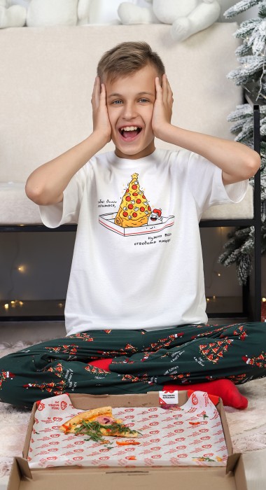 Костюм для мальчика. Футболка с принтом; модель свободная, со спущенной линией плеч. Брюки из полотна эксклюзивного дизайна, прямые, с боковыми карманами, на притачном поясе с отстроченной эластичной тесьмой.
