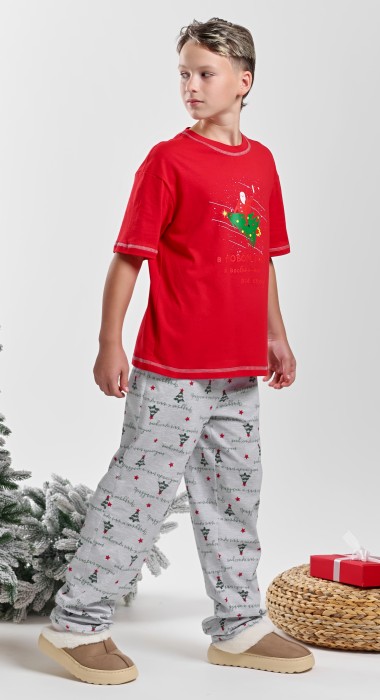 Костюм для мальчика из трикотажного полотна "кулирка" в комбинации двух видов: гладкокрашенного красного цвета и с набивным тематическим рисунком на сером фоне , состоящий из футболки и брюк. Футболка - классического силуэта, свободного покроя, с приспущенным плечом, с втачными рукавами длиной до локтя, горловиной овальной формы, обработанной втачной планкой и принтом в центре переда. По шву втачивани я планки настрочена декоративная (5-ниточная) отделочная строчка нитками контрастного цвета Подгибка низа рукавов и изделия так же выполнена с применением декоративной отделочной строчки. Брюки выполнены из полотна с набивным темкатическим рисунком, длинные, умеренной ширины, прямые, с эластичной тесьмой по талии.