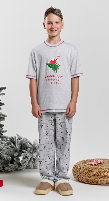 Костюм для мальчика из трикотажного полотна в комбинации двух видов: полотна "кулирка-кармеланж" и полотна "кулирка" с набивным тематическим рисунком на сером фоне , состоящий из футболки и брюк. Футболка - классического силуэта, свободного покроя, с приспущенным плечом, с втачными рукавами длиной до локтя, горловиной овальной формы, обработанной втачной планкой и принтом в центре переда. По шву втачивани я планки настрочена декоративная (5-ниточная) отделочная строчка нитками контрастного цвета Подгибка низа рукавов и изделия так же выполнена с применением декоративной отделочной строчки. Брюки выполнены из полотна с набивным темкатическим рисунком, длинные, умеренной ширины, прямые, с эластичной тесьмой по талии.