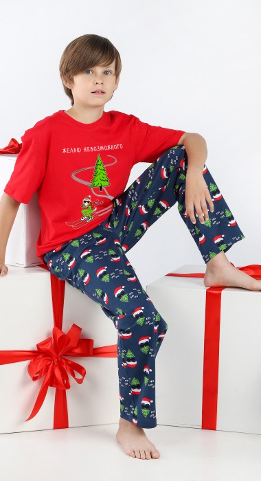 Костюм для мальчика, состоящий из футболки и брюк.Футболка - из гладкокрашеного полотна с принтом на детали переда, классического покроя, с короткими втачнвыми рукавами, удлиненными плечевыми швами и горловиной овальной формы, обработанной втачной планкой. По шву втачивания планки в горловину настрочена отделочная строчка. Нижние срезы рукавов и изделия обработаны швом вподгибку. Брюки - из полотна с набивным рисунком, длинные, на притачном поясе с эластичной тесьмой внутри и карманами в боковых швах. Нижние срезы обработаны швом вподгибку.