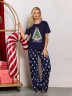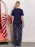 Костюм женский из трикотажного полотна "кулирка" в комбинации двух видов: гладкокрашеного и набивного с тематическим рисунком, состоящий из футболки и брюк. Футболка из гладкокрашеного полотна, классического покроя, с коротким втачными рукавами, горловиной овальной формы, обработанной втачной планкой и отделочной строчкой. В центре переда - принт, выполненгный в технике шелкографии. Брюки из полотна с набивным рисунком длинные, прямые, на притачном поясе с эластичной тесьмой внутри и карманами в боковыых швах.