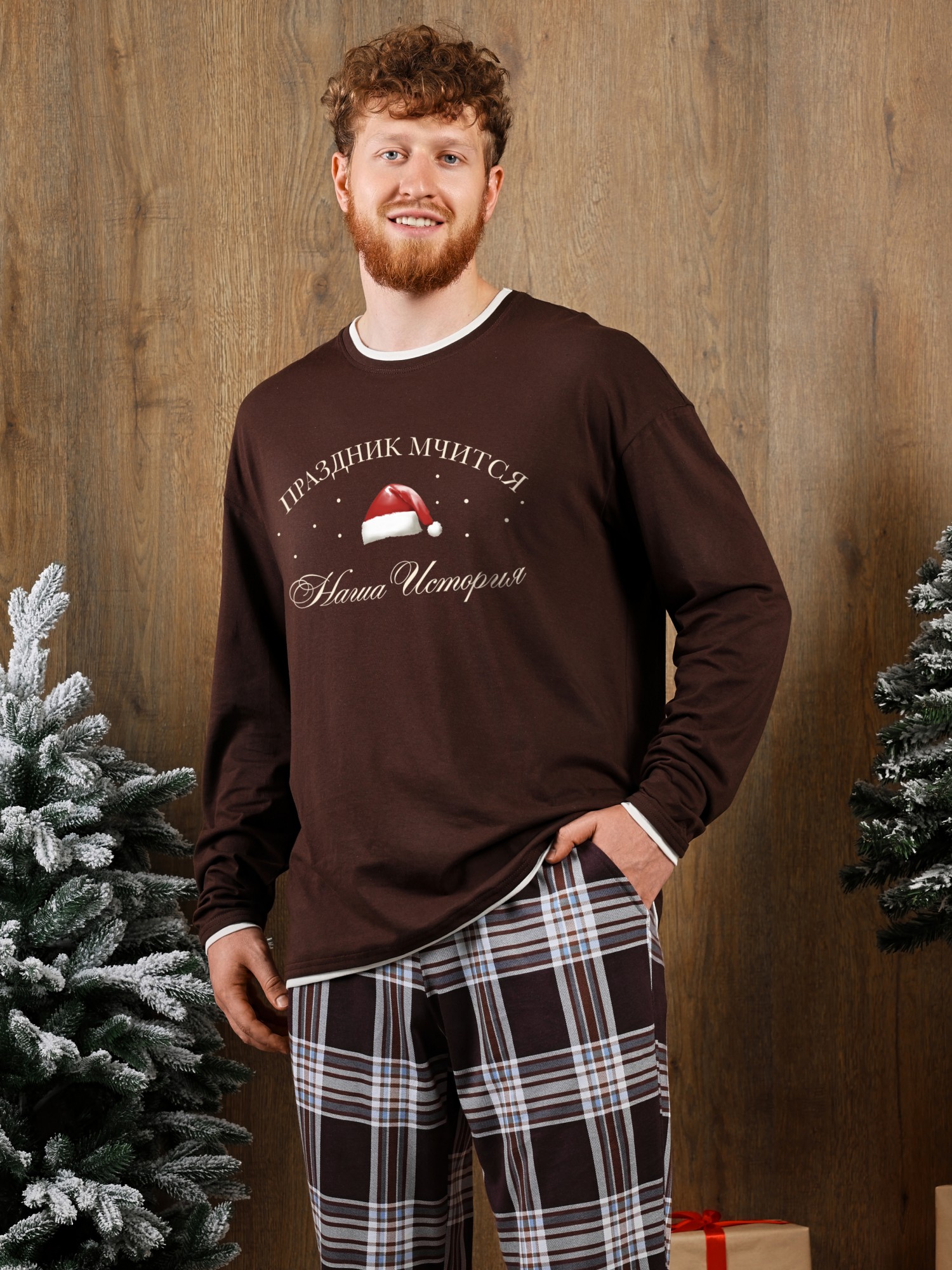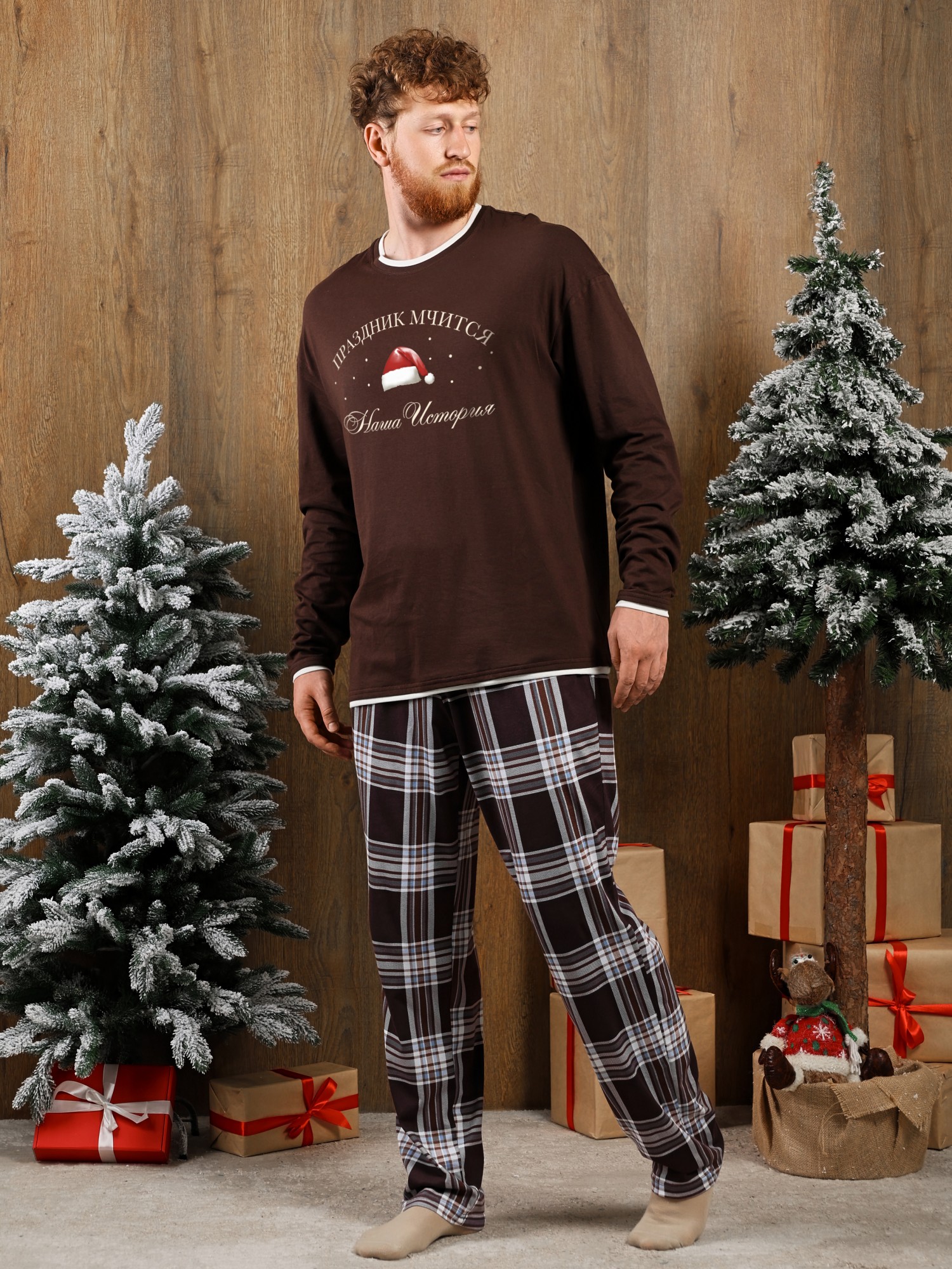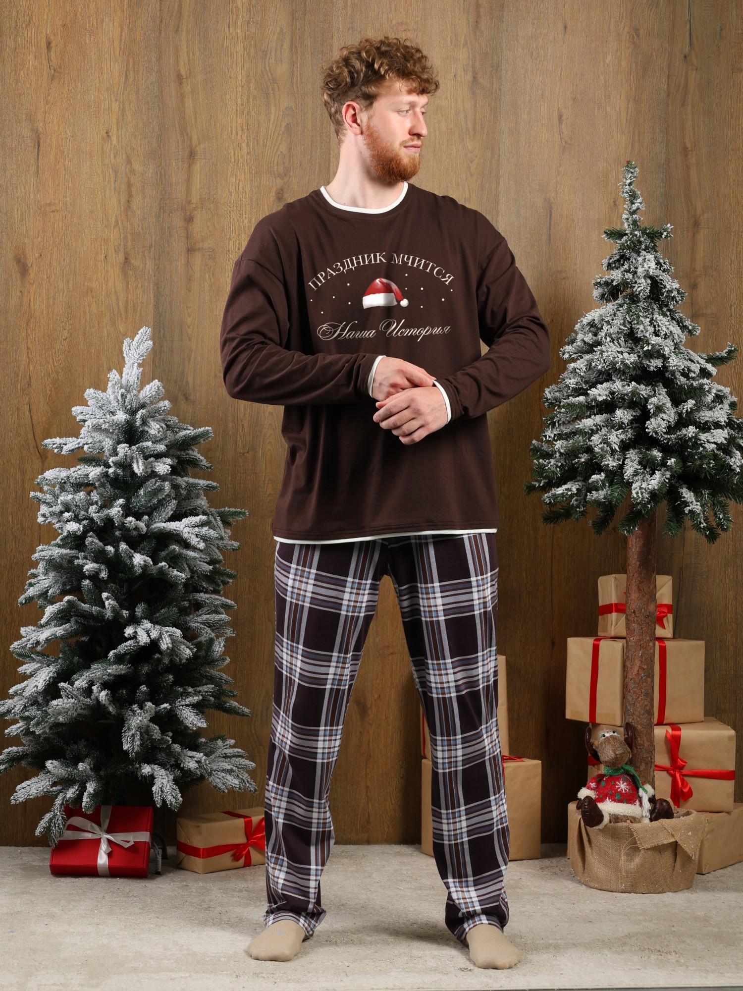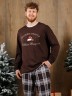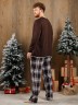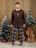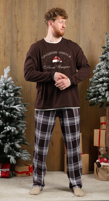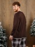 Костюм мужской из трикотажного полотна "кулирка" в комбинации двух видов: гладкокрашенного и с рисунком в крупную клетку, сочетающихся между собой по цвету, состоящий из джемпера и брюк. Джемпер - из гладкокрашеного полотна, свободного покроя, с длинными втачными рукавами и приспущенными плечами, с горловиной овальной формы и тематическим принтом, выполненным в технике шелкографии. Горловина, нижние срезы рукавов и низ изделия обработаны подгибкой с отделочным широким кантом контрастного цвета. Брюки - из полотна в клетку, свободного покроя, прямые, на притачном поясе с эластичной тесьмой внутри, с карманами в боковых швах. Нижние срезы обработаны подгибкой.
