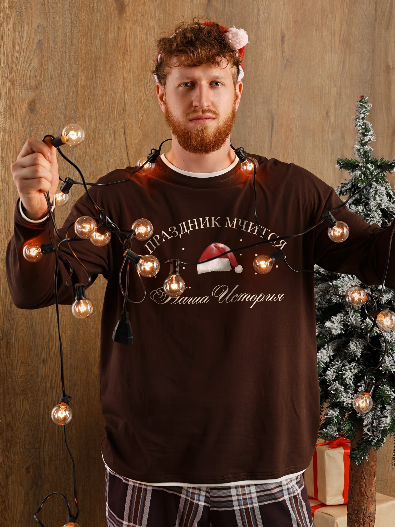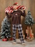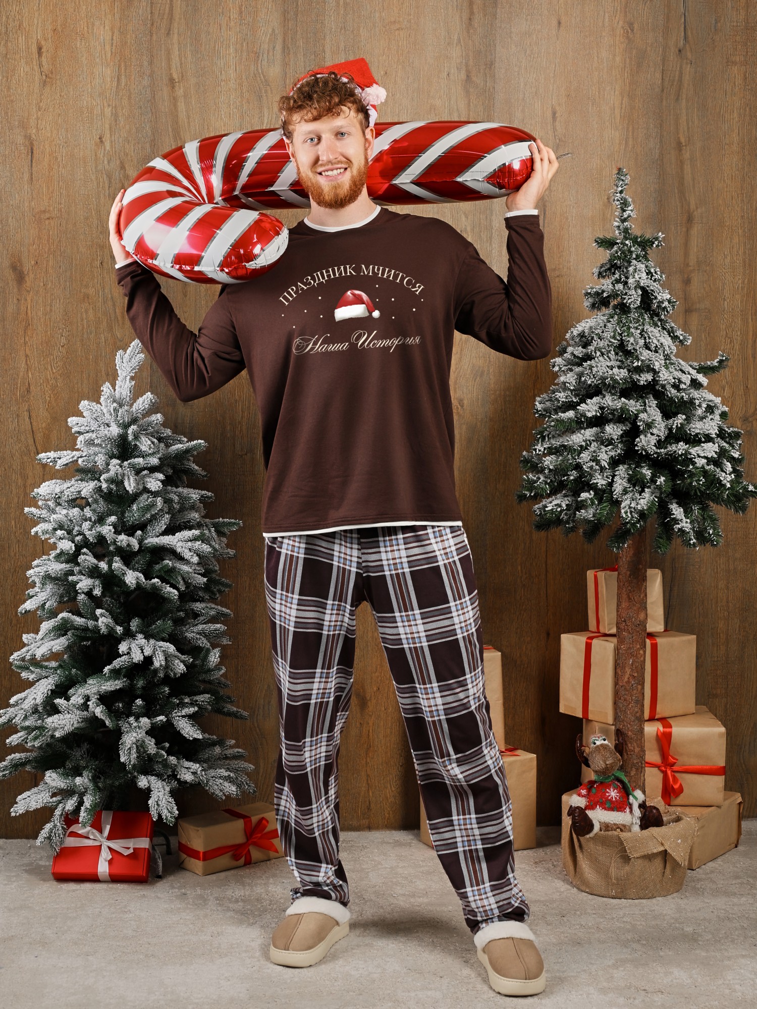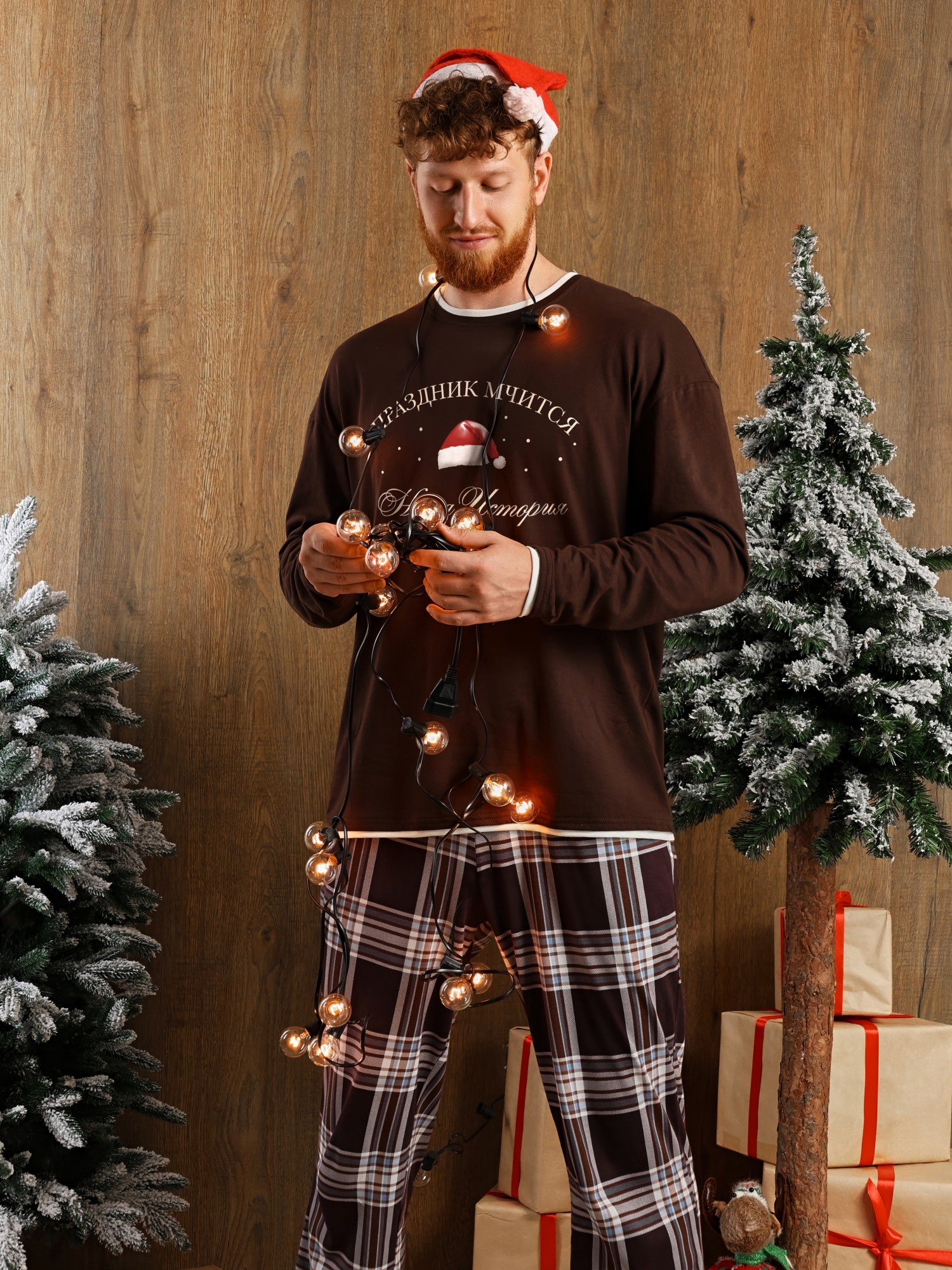 Костюм мужской из трикотажного полотна "кулирка" в комбинации двух видов: гладкокрашенного и с рисунком в крупную клетку, сочетающихся между собой по цвету, состоящий из джемпера и брюк. Джемпер - из гладкокрашеного полотна, свободного покроя, с длинными втачными рукавами и приспущенными плечами, с горловиной овальной формы и тематическим принтом, выполненным в технике шелкографии. Горловина, нижние срезы рукавов и низ изделия обработаны подгибкой с отделочным широким кантом контрастного цвета. Брюки - из полотна в клетку, свободного покроя, прямые, на притачном поясе с эластичной тесьмой внутри, с карманами в боковых швах. Нижние срезы обработаны подгибкой.