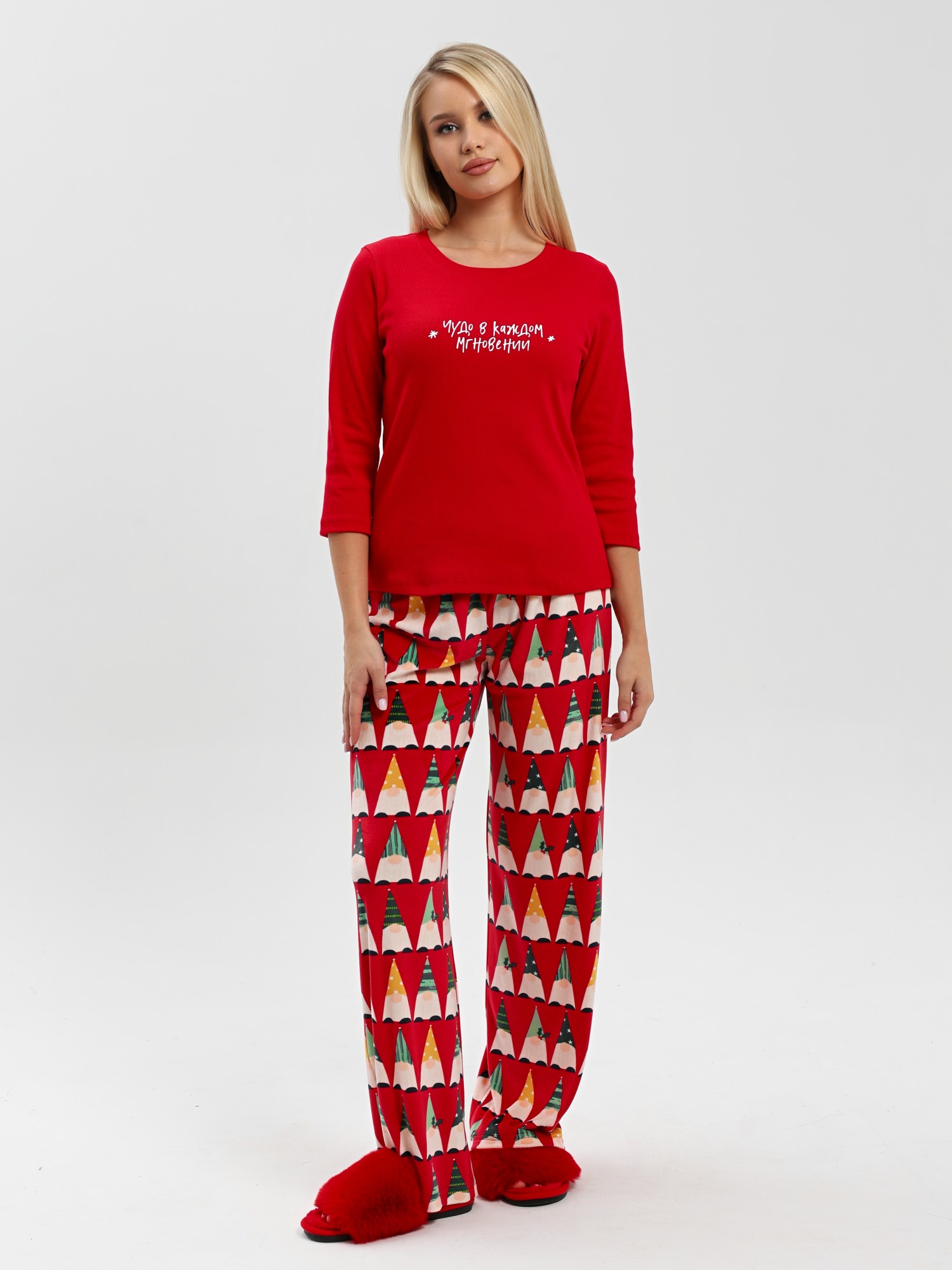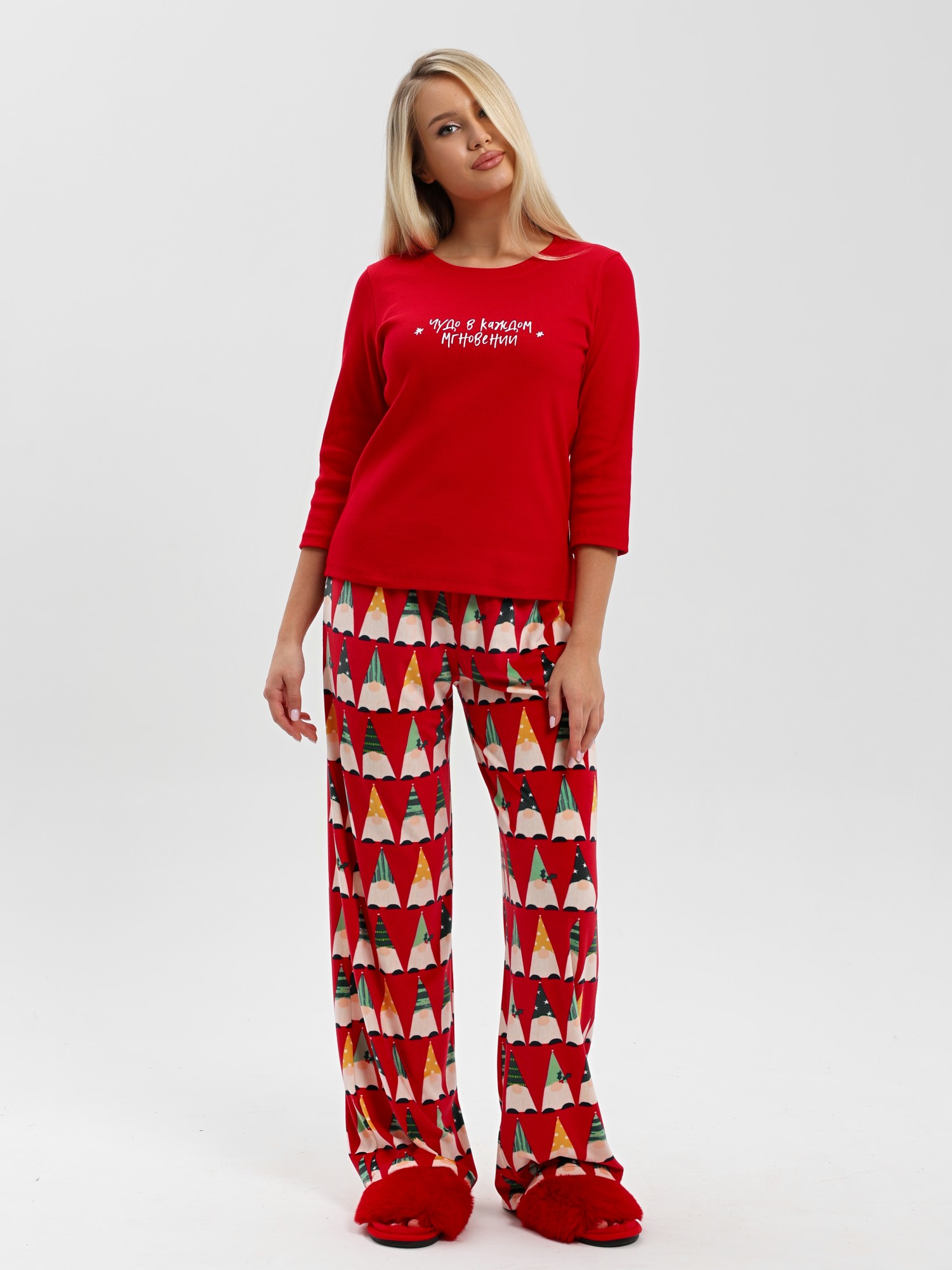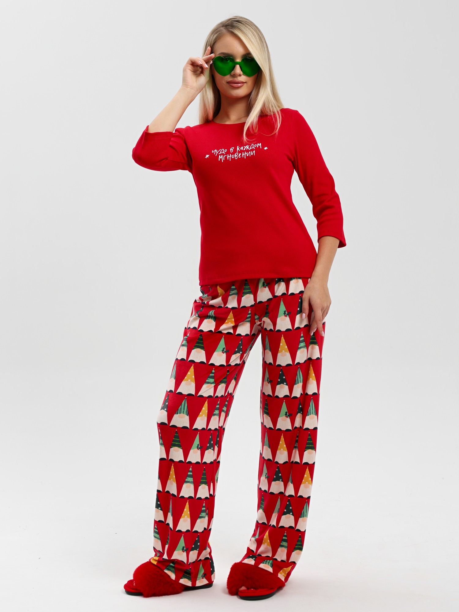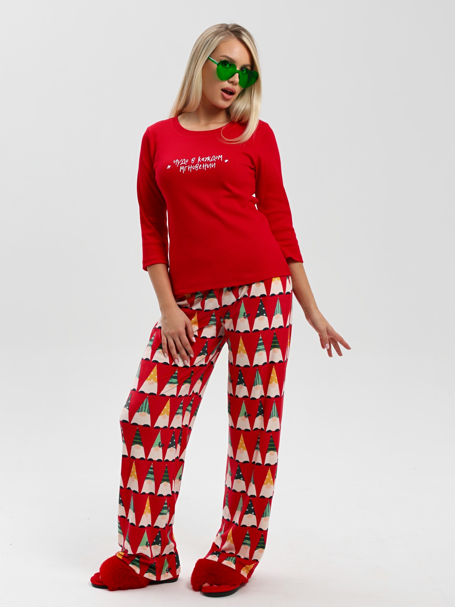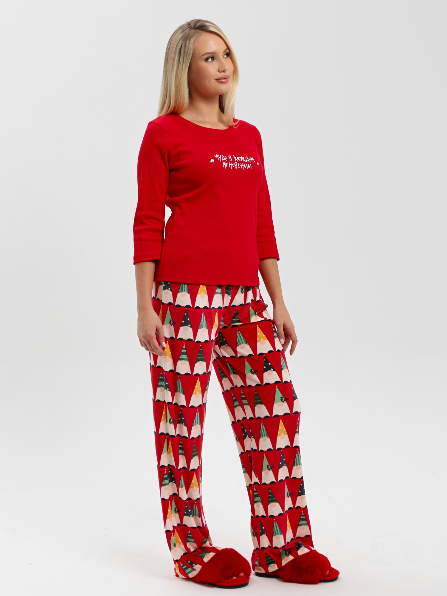 Костюм молодежный в комбинации двух видов полотен: из трикотажного полотна «кашкорсе» и «велюр стрейч», состоящий из футболки и брюк. Футболка - из гладкокрашеного трикотажного полотна «кашкорсе» классического покроя, с втачными рукавами длиной до локтя, горловиной овальной формы, обработанной втачной планкой и принтом на полочке, выполненным в технике «шелкографии».Брюки – из трикотажного полотна «велюр стрейч» с набивным рисунком, длинные, свободные, на притачном поясе с эластичной тесьмой внутри.