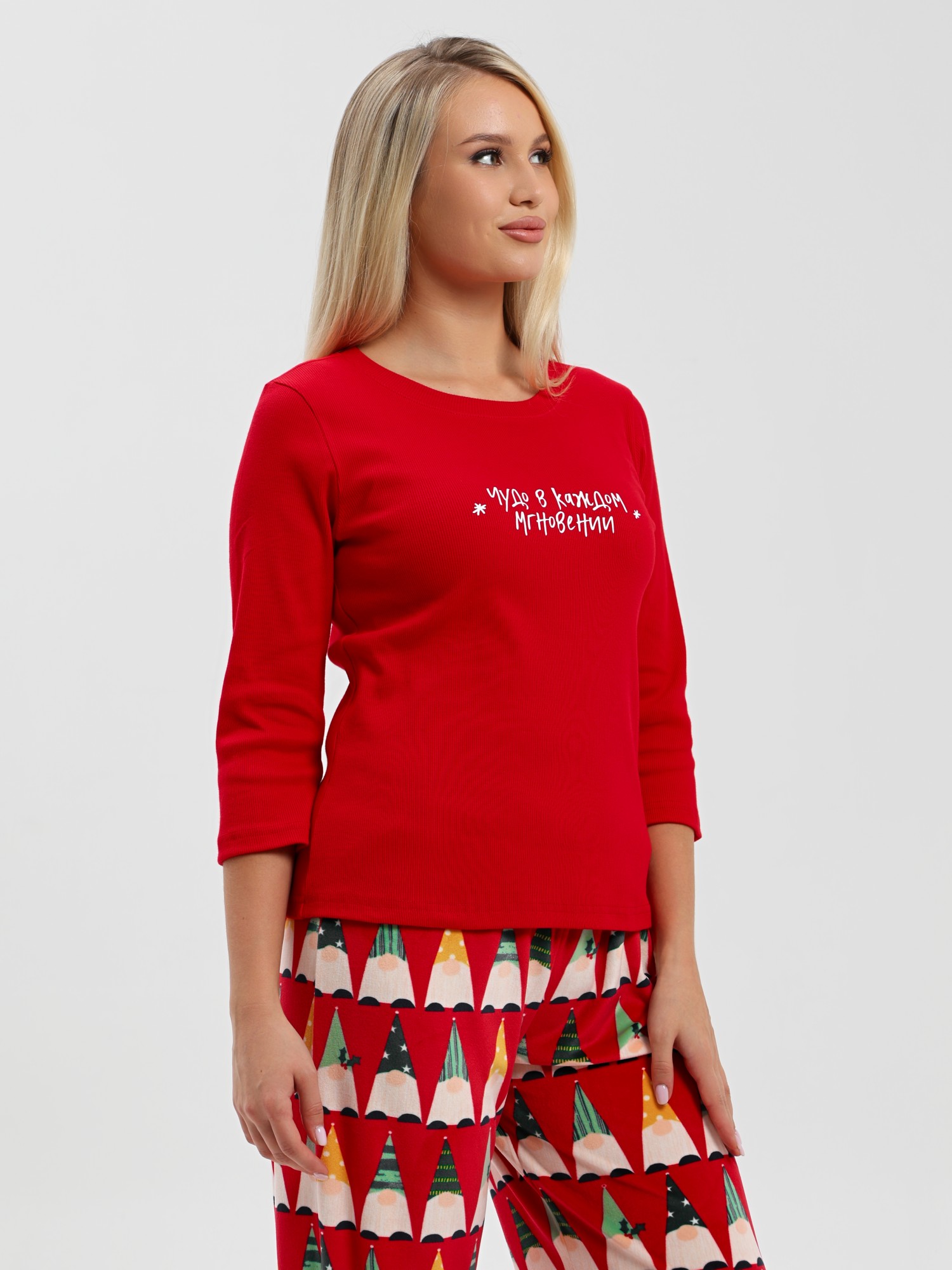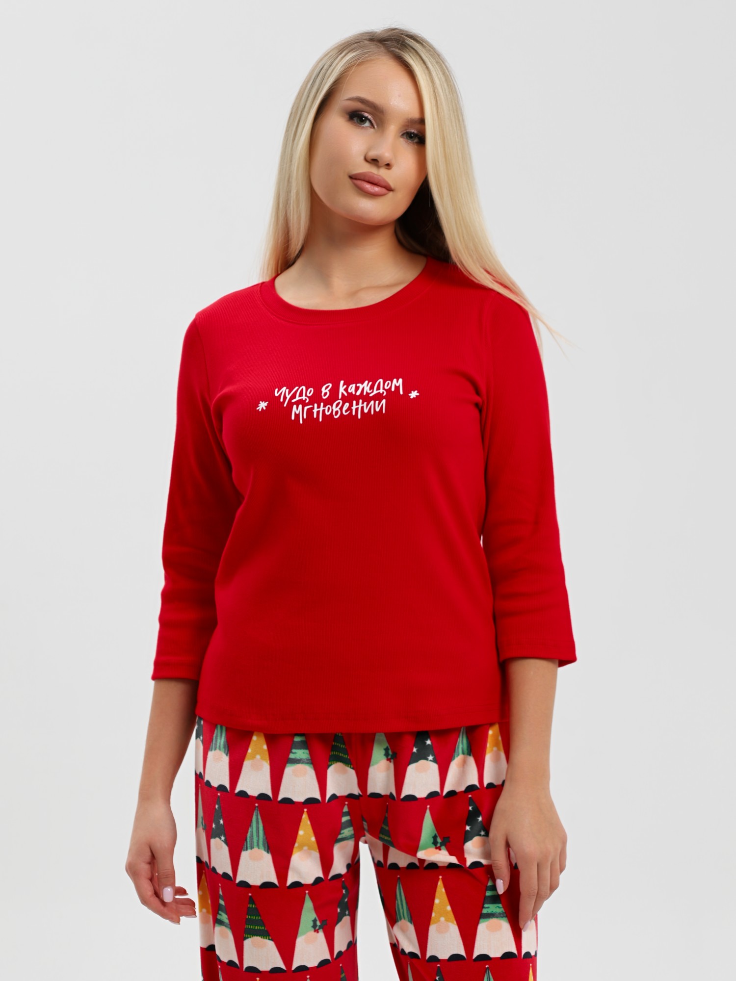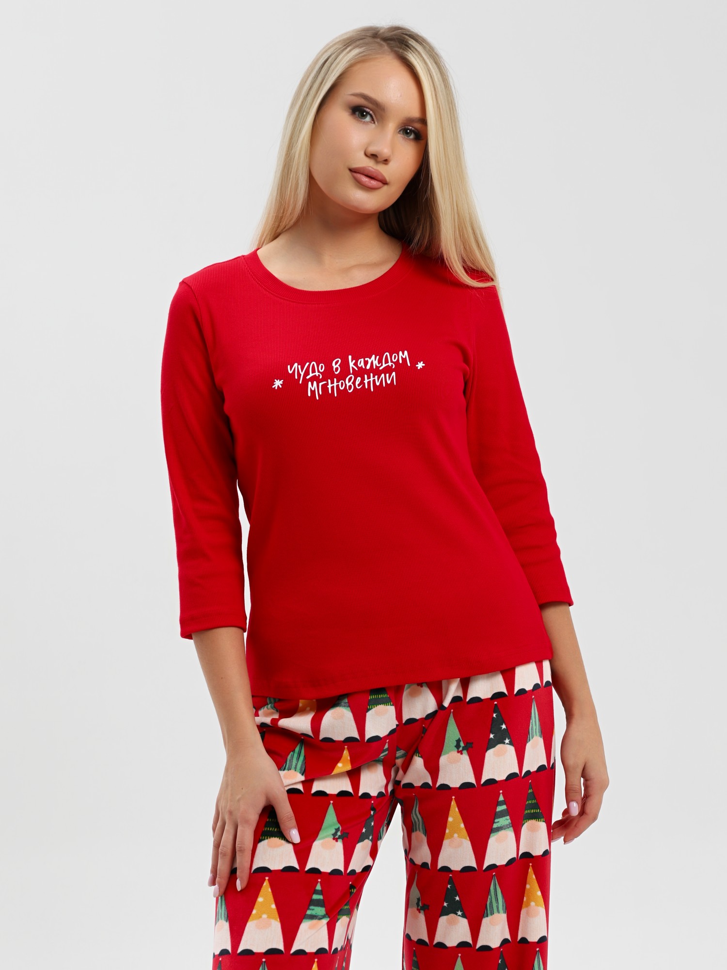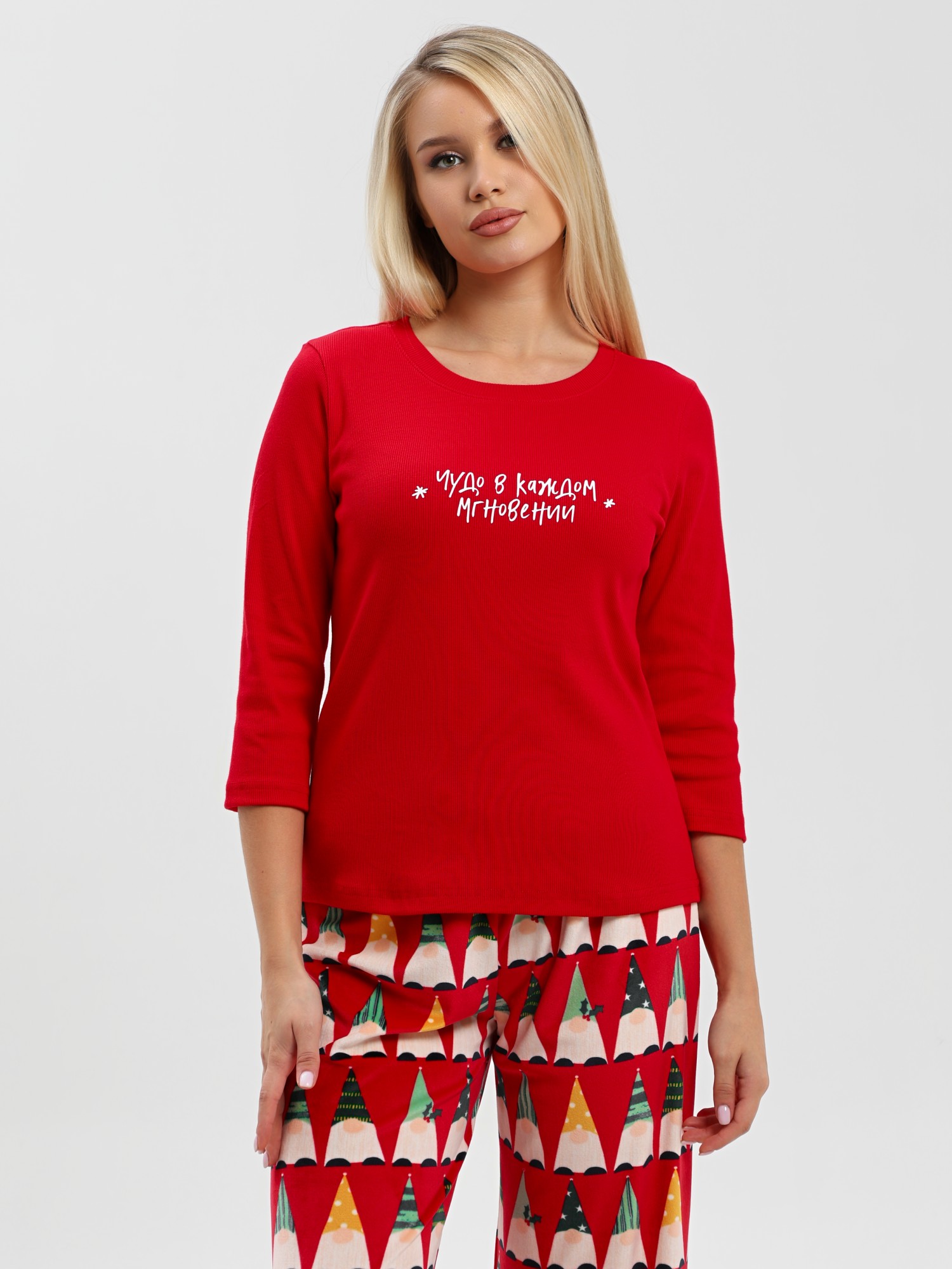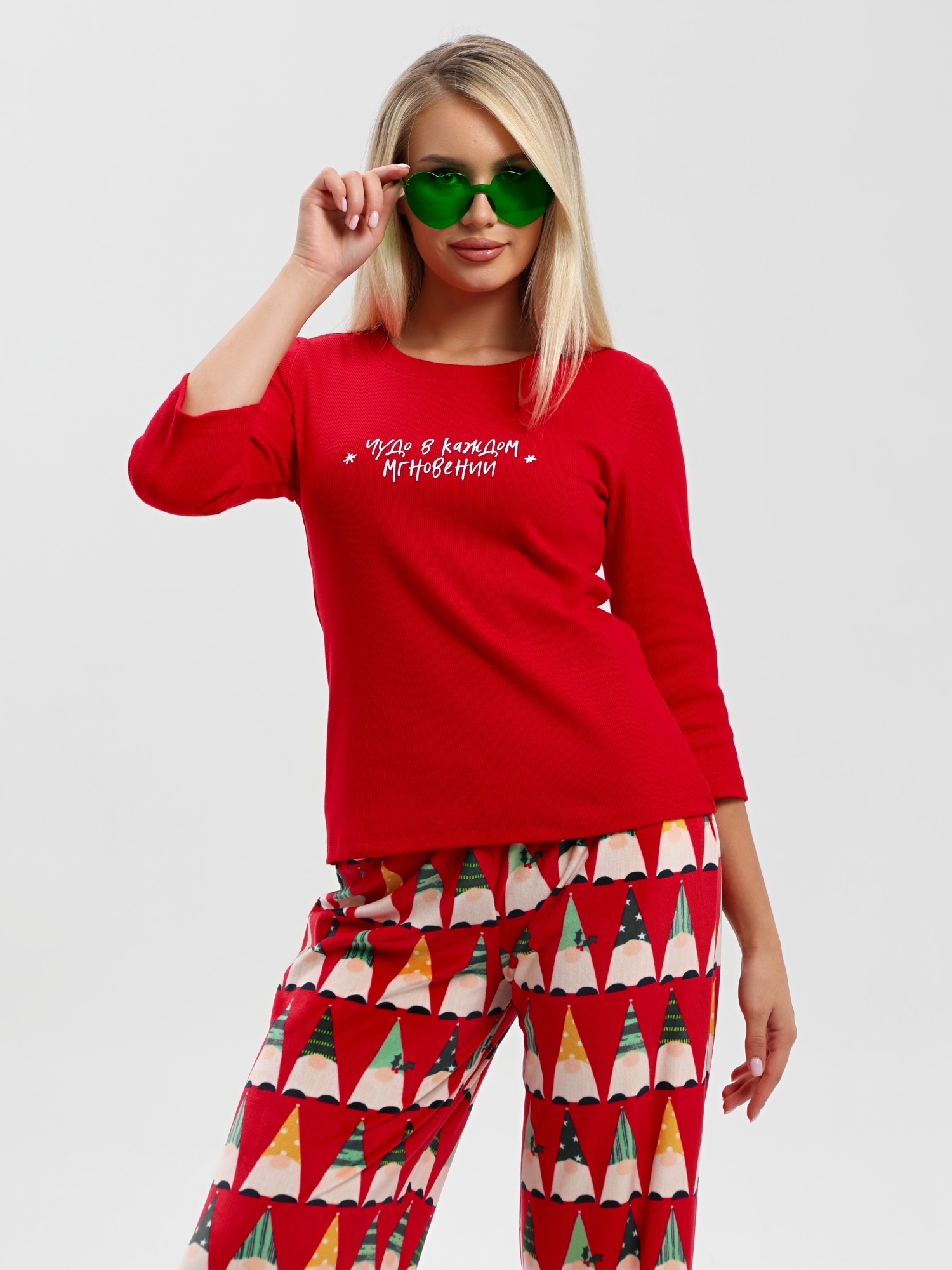 Костюм молодежный в комбинации двух видов полотен: из трикотажного полотна «кашкорсе» и «велюр стрейч», состоящий из футболки и брюк. Футболка - из гладкокрашеного трикотажного полотна «кашкорсе» классического покроя, с втачными рукавами длиной до локтя, горловиной овальной формы, обработанной втачной планкой и принтом на полочке, выполненным в технике «шелкографии».Брюки – из трикотажного полотна «велюр стрейч» с набивным рисунком, длинные, свободные, на притачном поясе с эластичной тесьмой внутри.