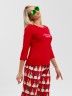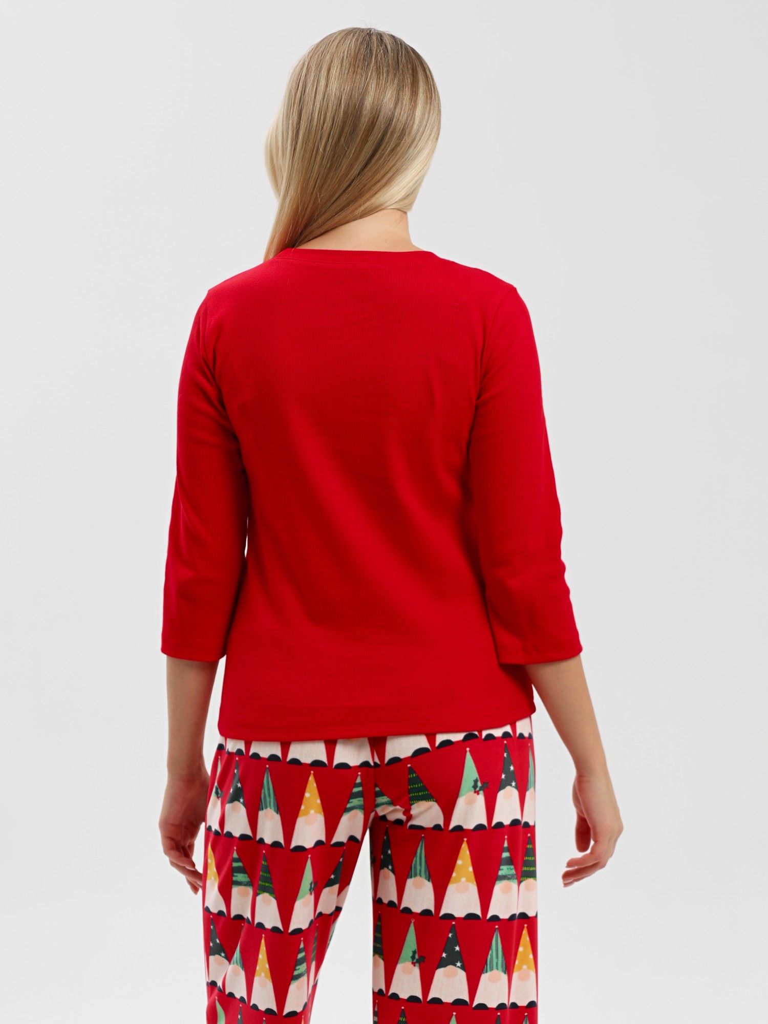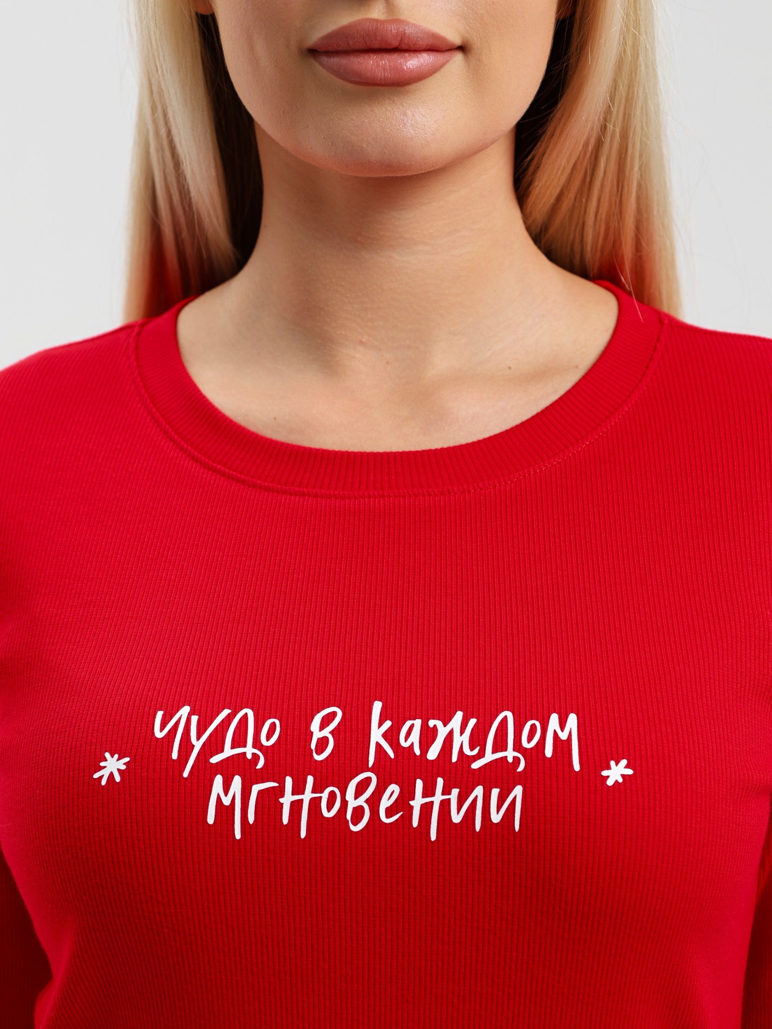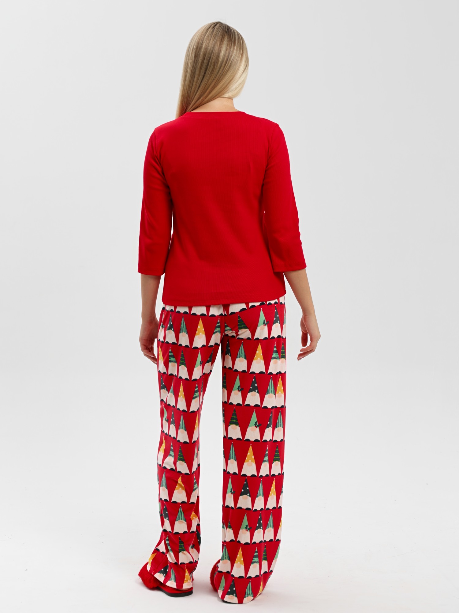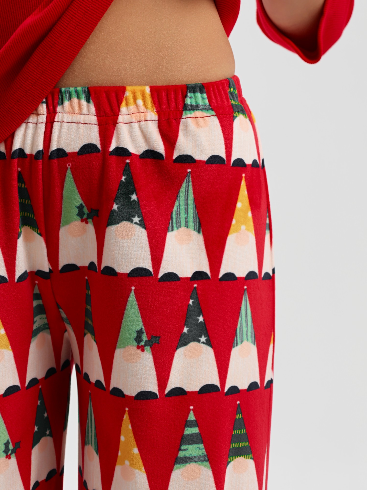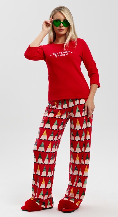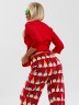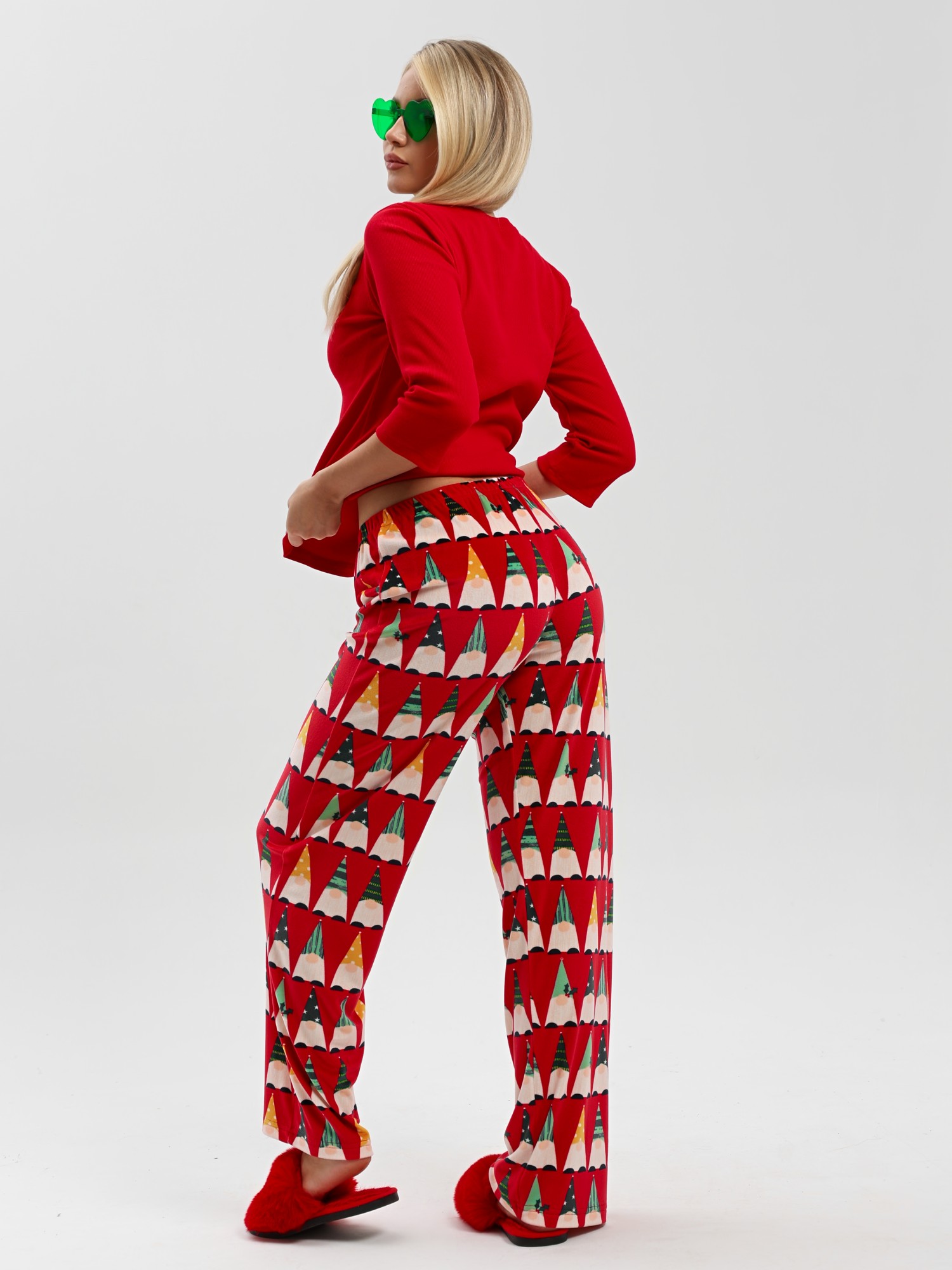 Костюм молодежный в комбинации двух видов полотен: из трикотажного полотна «кашкорсе» и «велюр стрейч», состоящий из футболки и брюк. Футболка - из гладкокрашеного трикотажного полотна «кашкорсе» классического покроя, с втачными рукавами длиной до локтя, горловиной овальной формы, обработанной втачной планкой и принтом на полочке, выполненным в технике «шелкографии».Брюки – из трикотажного полотна «велюр стрейч» с набивным рисунком, длинные, свободные, на притачном поясе с эластичной тесьмой внутри.
