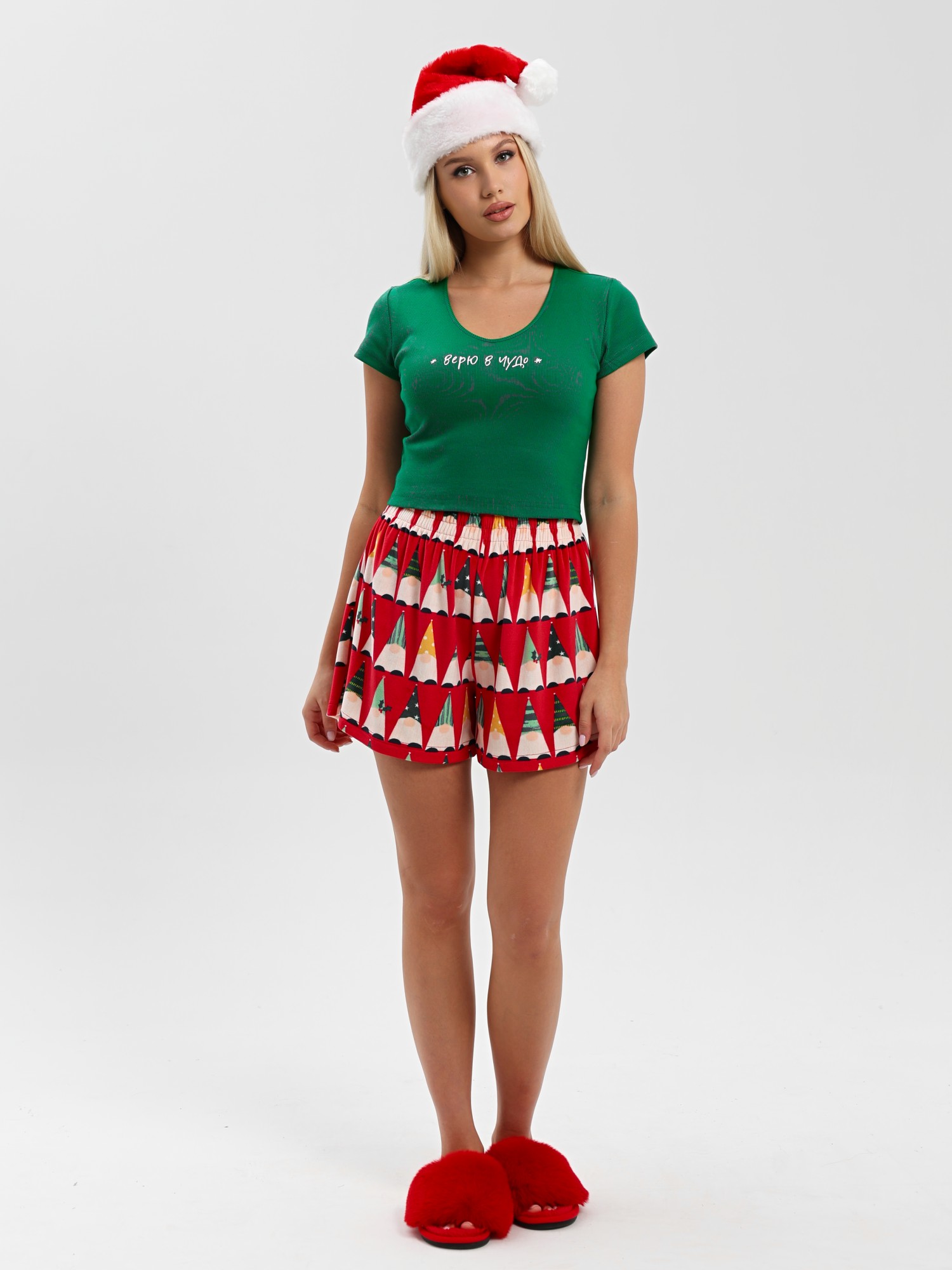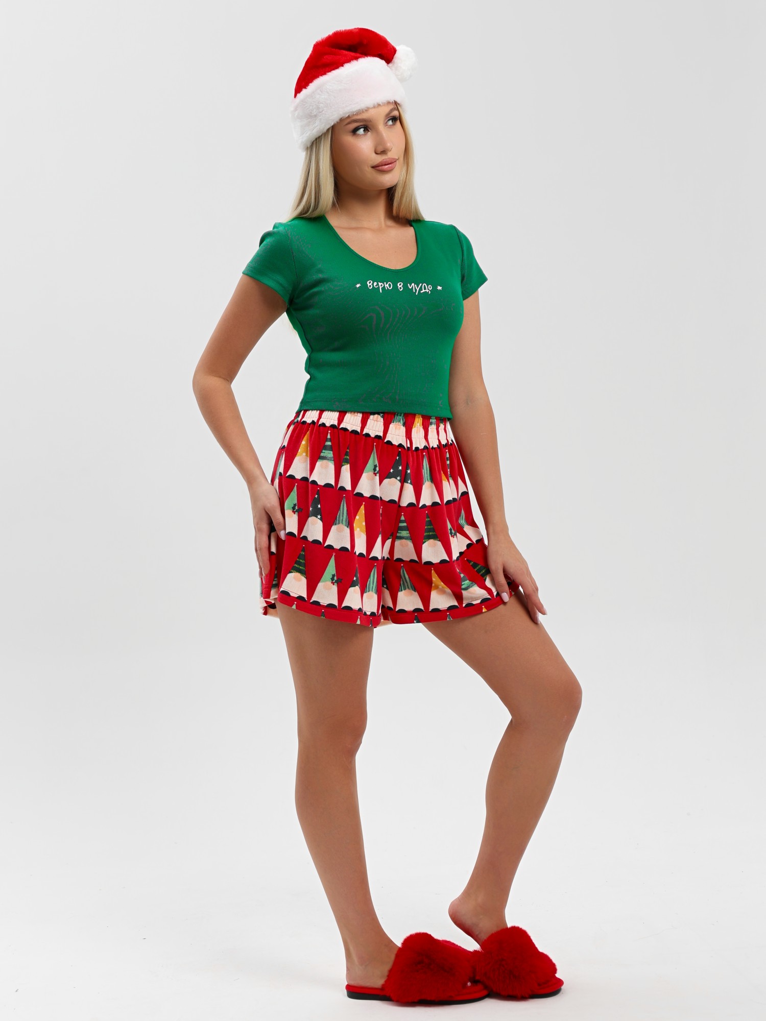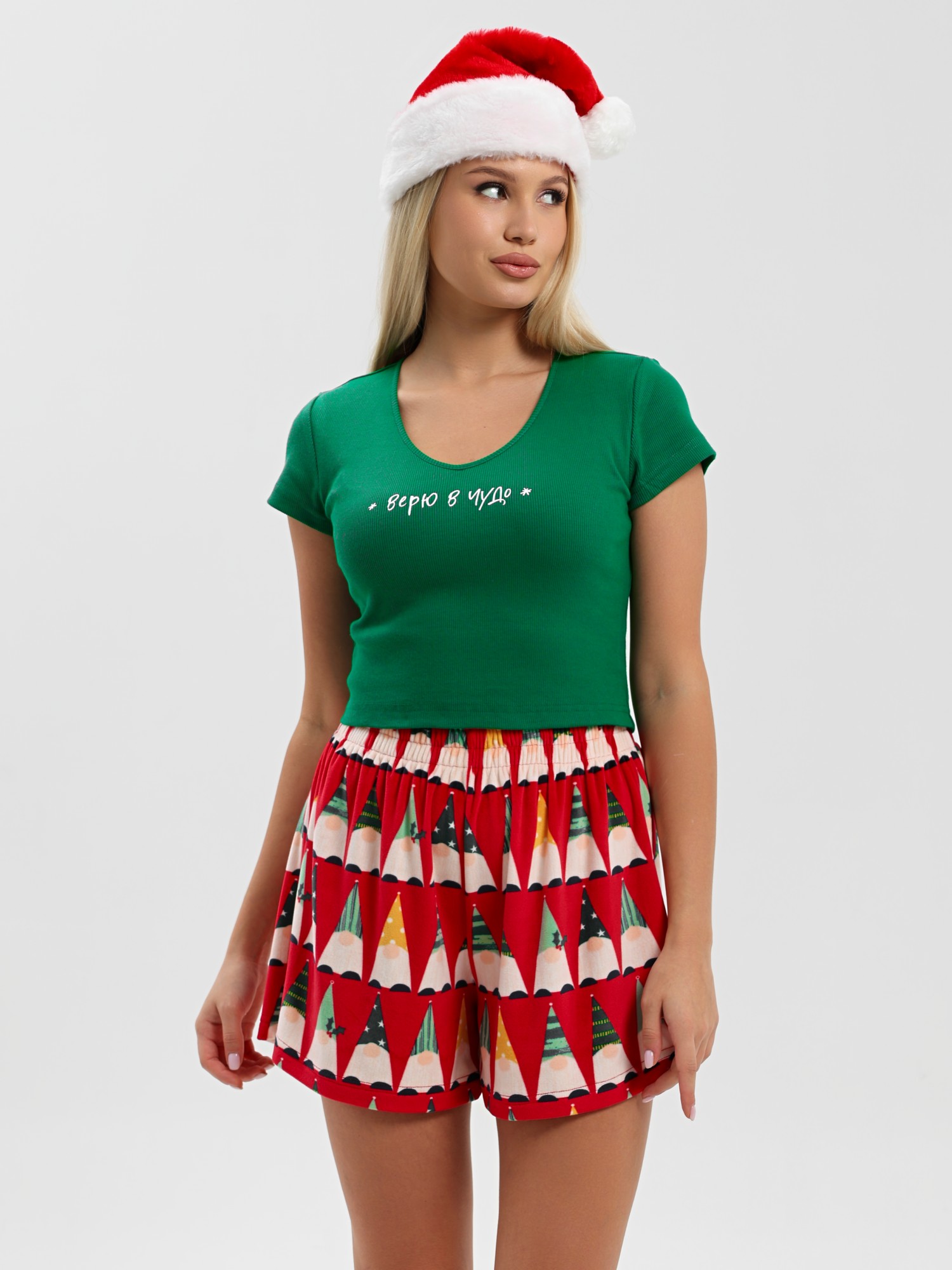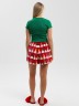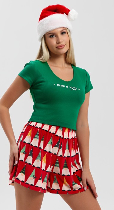 Костюм молодежный из трикотажного полотна двух видов: «кашкорсе» и «велюр стрейч», состоящий из футболки и шорт. Футболка – из гладкокрашеного полотна «кашкорсе», классического покроя, с короткими втачными рукавами, горловиной V-образной формы, окантованной основным материалом, принтом на полочке, выполненным в технике «шелкографии».Шорты – из полотна «велюр стрейч » с набивным рисунком, средней длины, широкие, с эластичной тесьмой по талии.