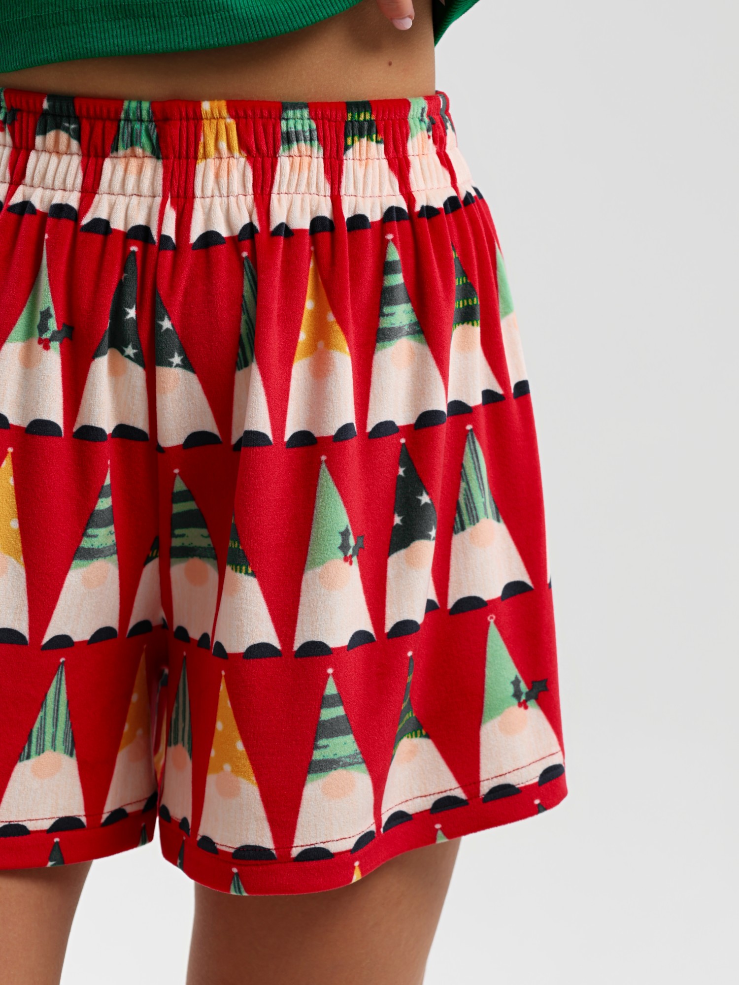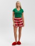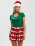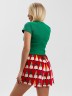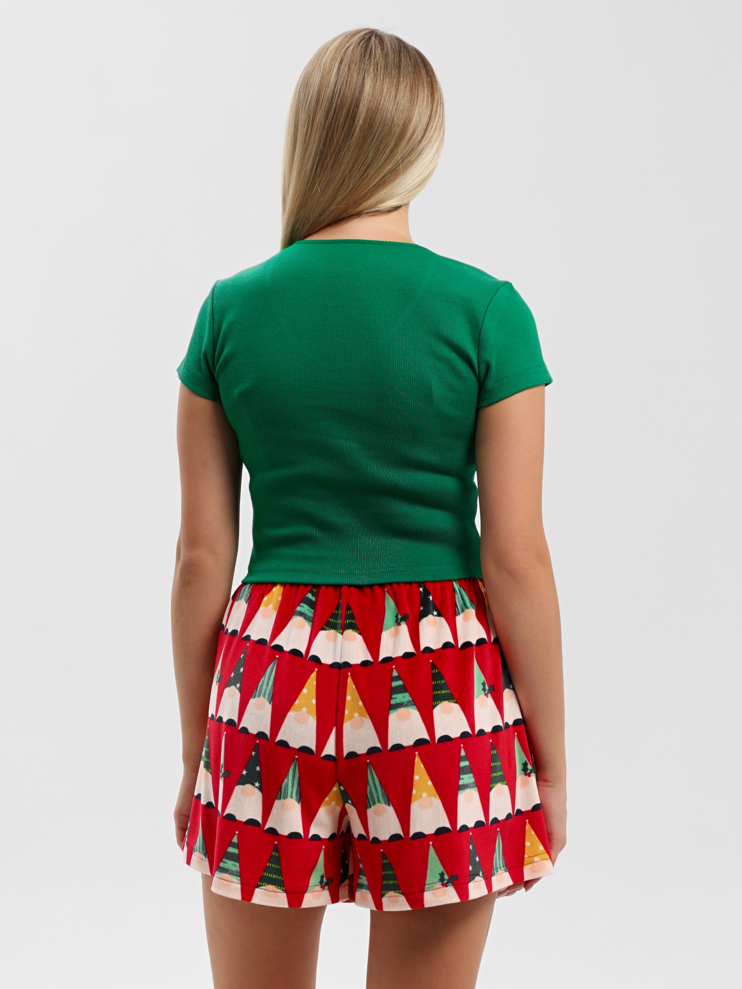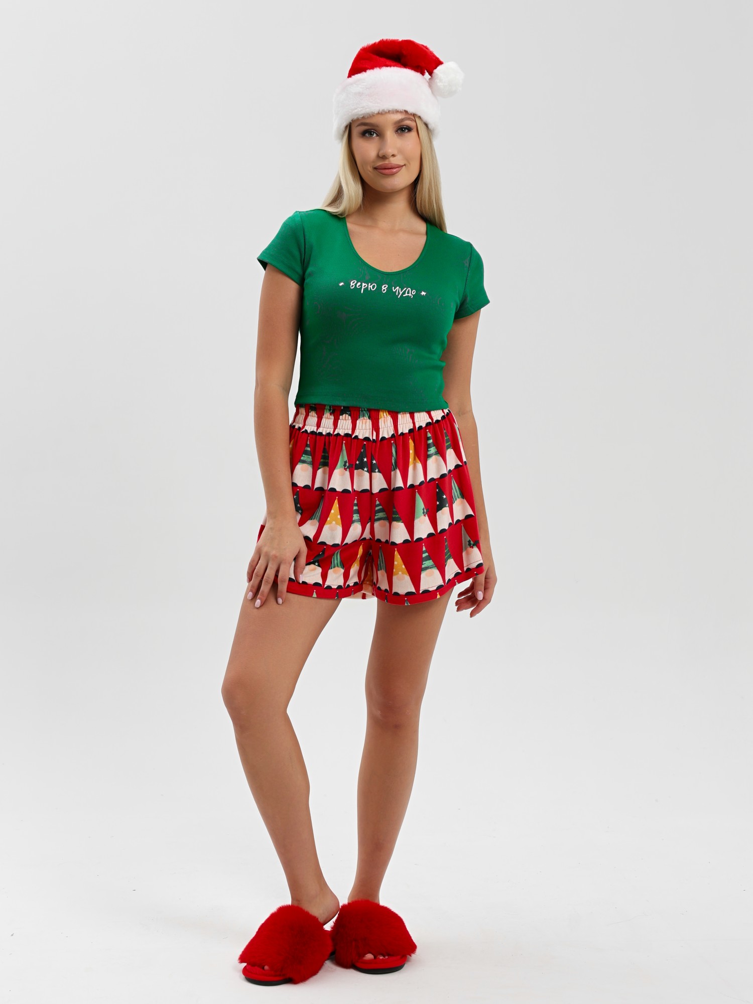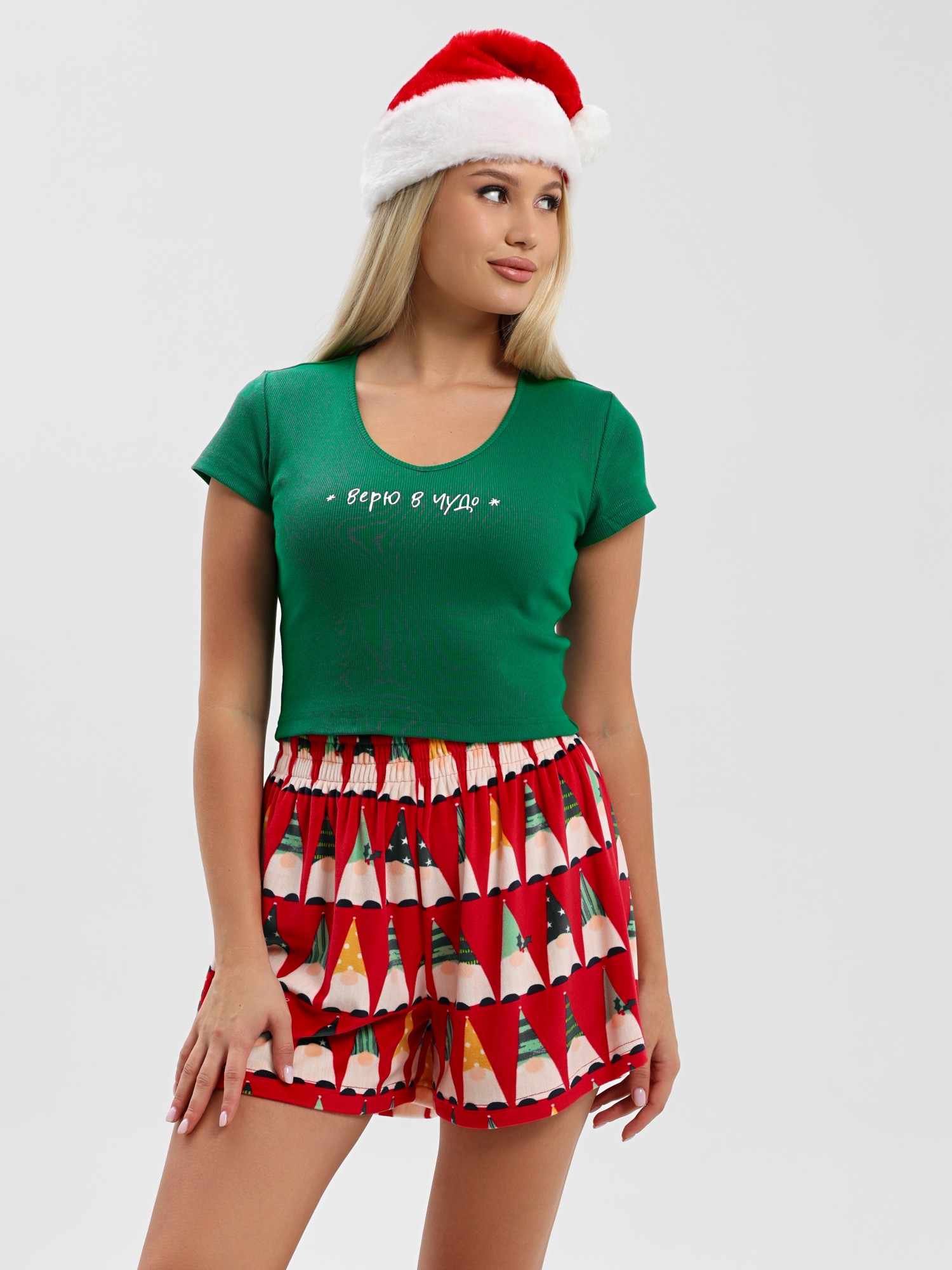 Костюм молодежный из трикотажного полотна двух видов: «кашкорсе» и «велюр стрейч», состоящий из футболки и шорт. Футболка – из гладкокрашеного полотна «кашкорсе», классического покроя, с короткими втачными рукавами, горловиной V-образной формы, окантованной основным материалом, принтом на полочке, выполненным в технике «шелкографии».Шорты – из полотна «велюр стрейч » с набивным рисунком, средней длины, широкие, с эластичной тесьмой по талии.