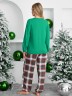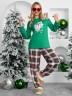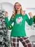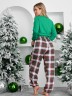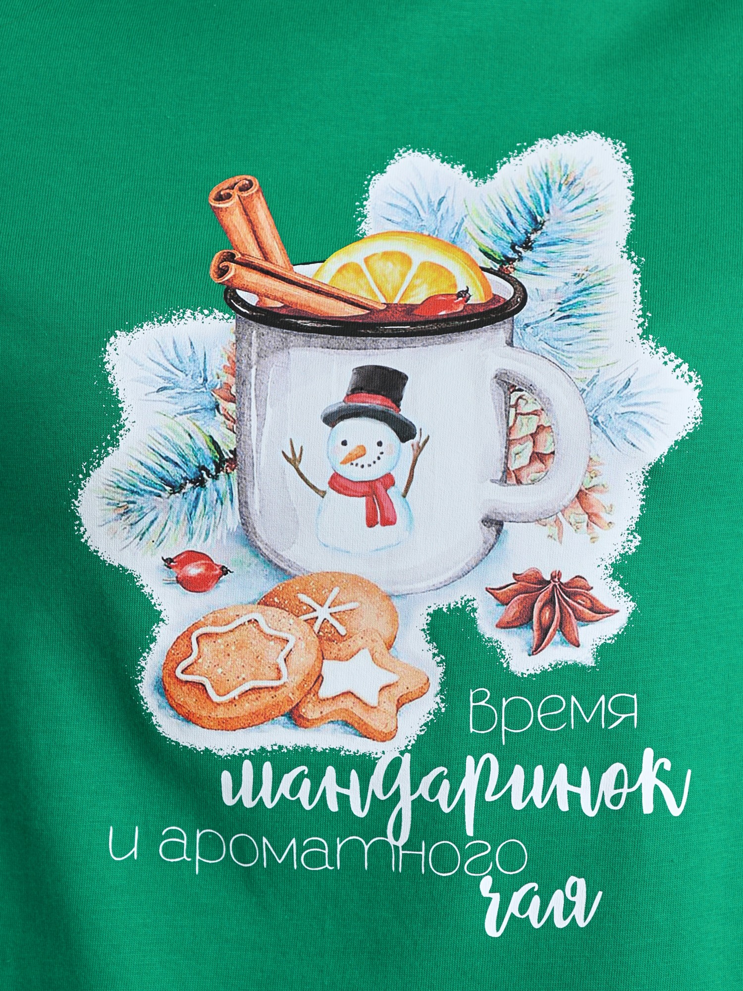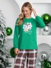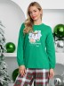 Костюм молодежный из трикотажного полотна «кулирка» в комбинации двух видов: с набивным рисунком и гладкокрашенного в единой цветовой гамме, состоящий из лонгслива и брюк. Лонгслив - из гладкокрашенного полотна, классического покроя, с длинными втачными рукавами по нижнему срезу с эластичной тесьмой, горловиной овальной формы и принтом на полочке, выполненным в технике «шелкографии». Горловина окантована основным материалом.Брюки - из полотна с набивным рисунком, длинные, с карманами в боковых швах. Притачной пояс и низ брюк с эластичной тесьмой.