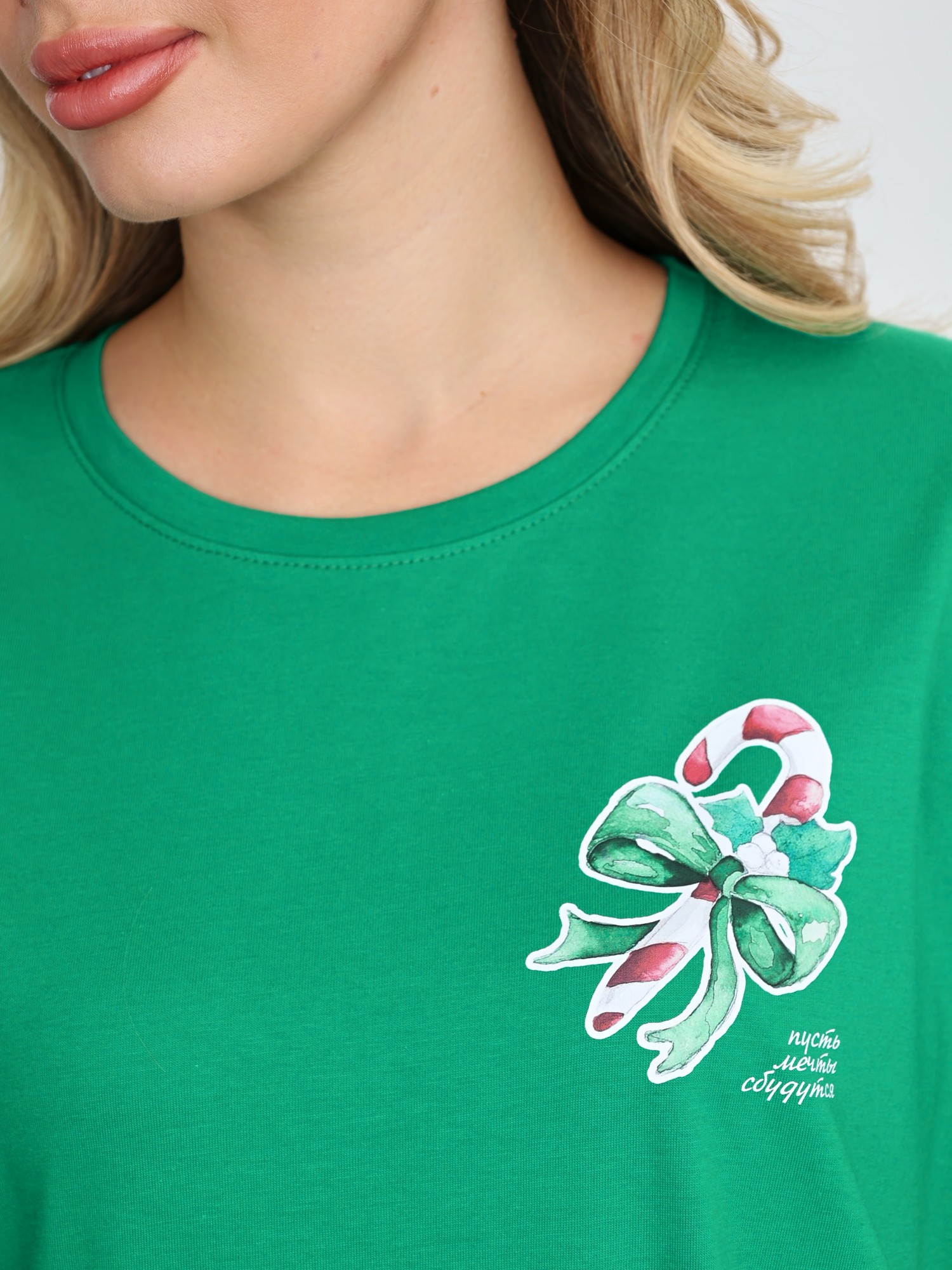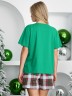 Костюм молодежный из трикотажного полотна «кулирка» » в комбинации двух видов: с набивным рисунком и гладкокрашенного в единой цветовой гамме, состоящий из футболки и шорт. Футболка - из гладкокрашенного полотна, классического покроя, с короткими втачными рукавами, горловиной овальной формы и принтом на полочке, выполненным в технике «шелкографии». Горловина обработана притачной бейкой из основного материала.