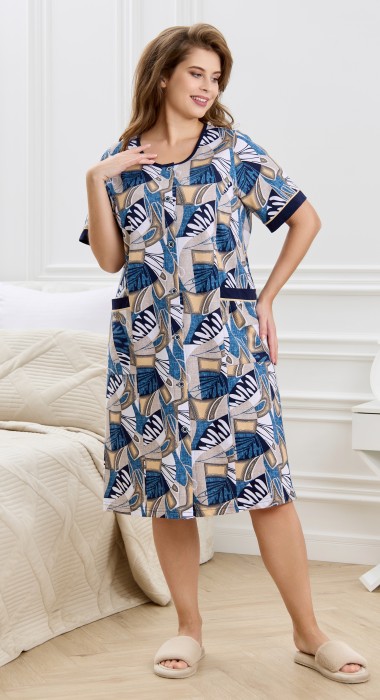 Халат женский из трикотажного полотна «кулирка» с набивным рисунком, прямого силуэта, с короткими втачными рукавами, с горловиной овальной формы, окантованной основным материалом, с рельефами, выходящими из пройм, двумя накладными карманами на уровне бедер и центральной бортовой застежкой на обметанные петли и пуговицы. Нижние срезы рукавов обработаны притачными манжетами, верхние срезы карманов – с притачными планками. В швах соединения манжет и планок с деталями – узкий кант контрастного цвета.