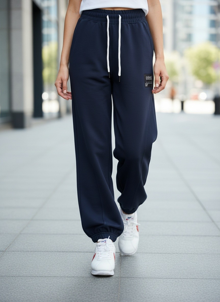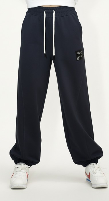 Брюки для девочки из трикотажного полотна "футер-двунитка", на притачном поясе с эластичной тесьмой внутри, с карманами в боковых швах и отделочными деталями фигурной формы на передних половинах. Нижние срезы брюк обработаны с эластичной тесьмой. По швам притачивания отделочных деталей, декоративных вставок и карманам настрочены отделочные строчки. На правой передней половине брюк ниже уровня колена настрочен декоративный элемент прямоугольной формы. Через две петли в центре пояса продет шнурок, позволяющий регулировать степень прилегания изделия по талии.