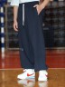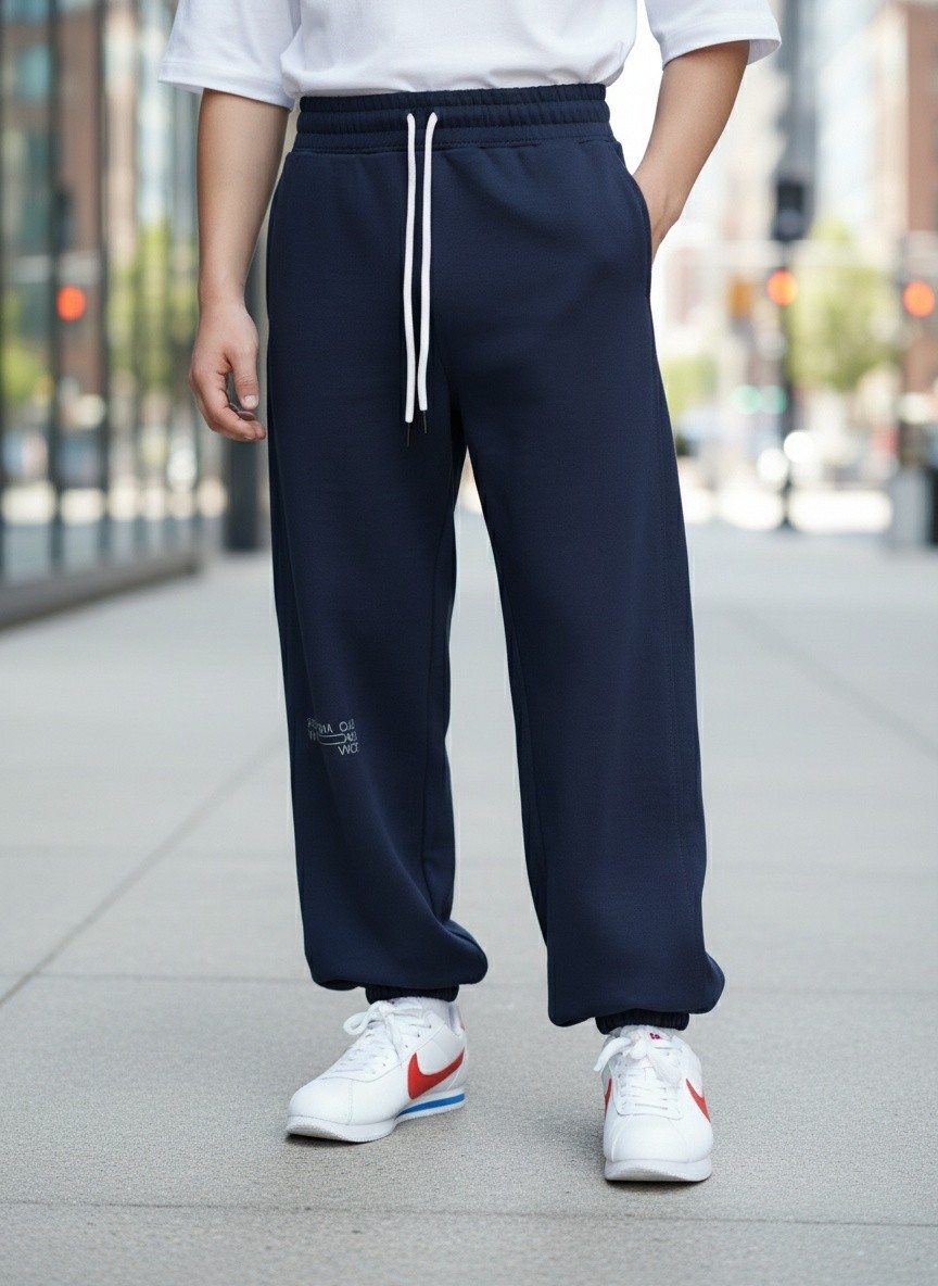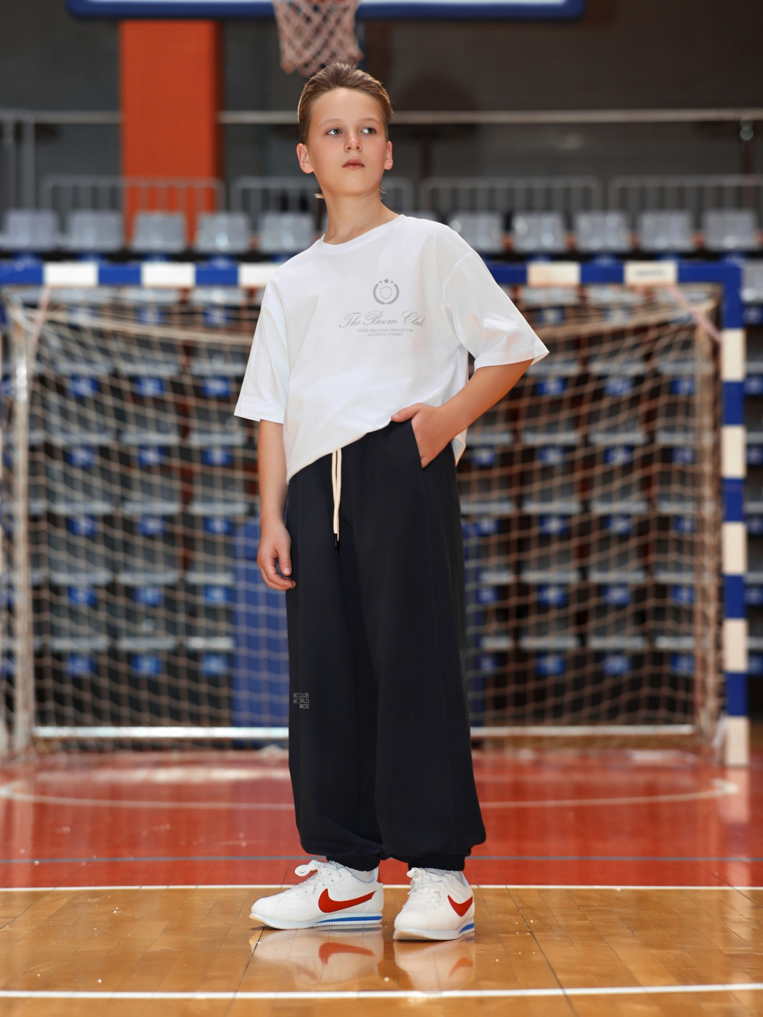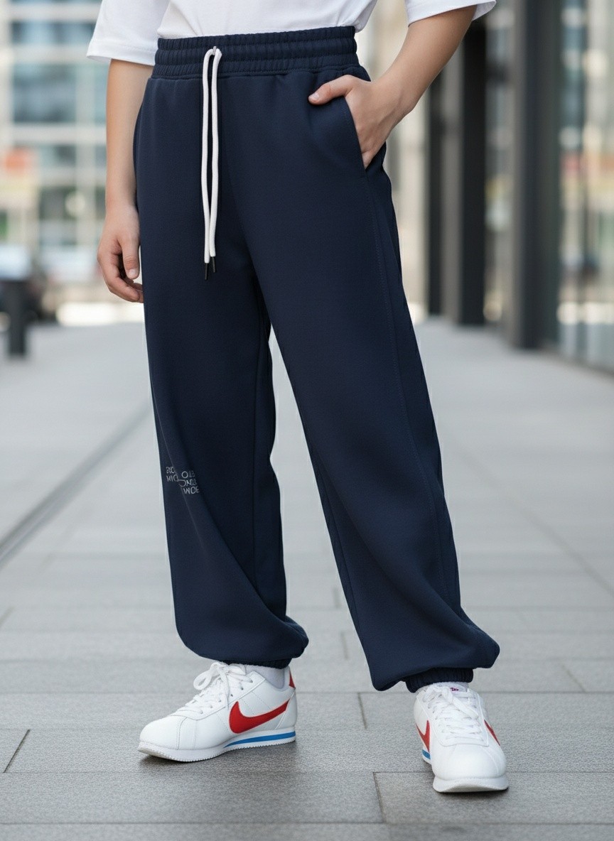 Брюки для мальчика из трикотажного полотна "футер-двунитка" на притачном поясе с эластичной тесьмой внутри, декоративными вставками в боковых швах и карманами, обработанными в соединительных швах передних половин с декоративными вставками. Нижние срезы брюк обработаны с эластичной тесьмой. По швам втачивания вставок и входам в карманы настрочены отделочные строчки. Через петлю пояса продет шнрок, позволяющий регулировать степень прилегания изделия по талии.