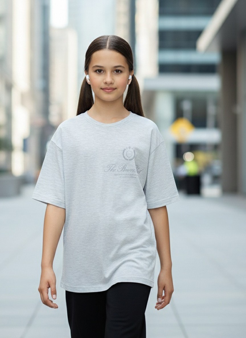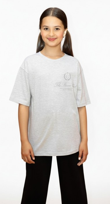 Футболка для девочки из трикотажного полотна "кармеланж" с приспущенным плечом, втачными короткими рукавами, горловиной овальной формы, обработанной втачной планкой и принтом на полочке, выполненным в технике шелкографии. По шву втачивания планки в горловину настрочена отделочная строчка.