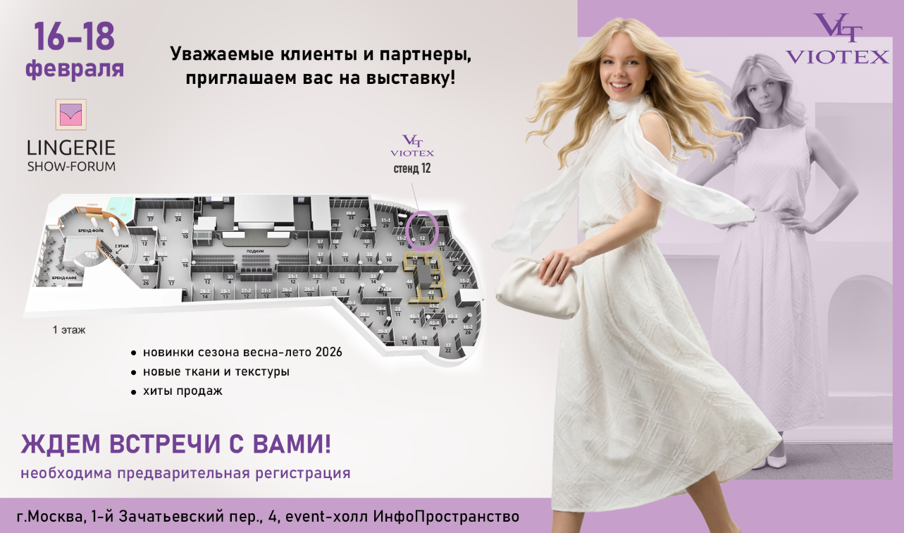 Уважаемые клиенты и партнеры, мы приглашаем вас посетить наш выставочный стенд на Международной выставке белья, купальников, домашней одежды и чулочно-носочных изделий LINGERIE SHOW-FORUM!