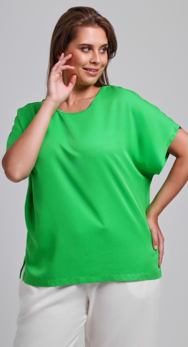 Блуза женская из гладкокрашеного тканого штапельного полотна, прямого силуэта, с горловиной овальной формы и цельнокроеными рукавами. Горловина окантована основным материалом, в боковых швах разрезы.