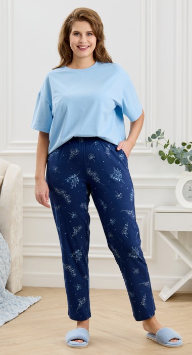 Брюки женские из трикотажного полотна «кулирка» с набивным рисунком, прямого кроя слегка зауженные книзу, с карманами в боковых швах, на притачном поясе с эластичной тесьмой внутри.
