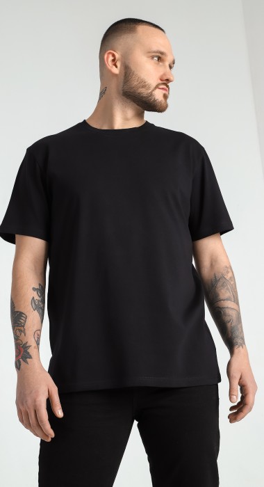 Базовая однотонная мужская футболка прямого силуэта без принта. Выполнена из трикотажного полотна: хлопкового с добавлением лайкры. Горловина округлой формы с усилителем горловины спинки.