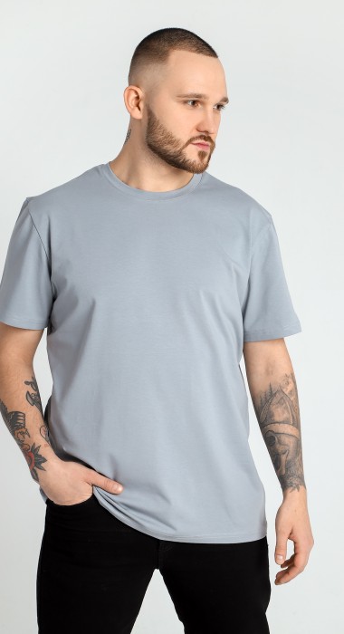 Базовая однотонная мужская футболка прямого силуэта без принта. Выполнена из трикотажного полотна: хлопкового с добавлением лайкры. Горловина округлой формы с усилителем горловины спинки.