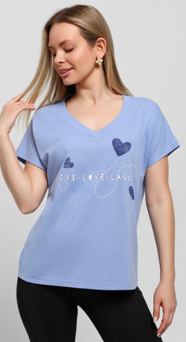 Футболка – из гладкокрашеного полотна, с короткими цельнокроеными рукавами, горловиной V-образной формы, обработанной притачной бейкой и принтом на полочке, выполненным в технике шелкографии.