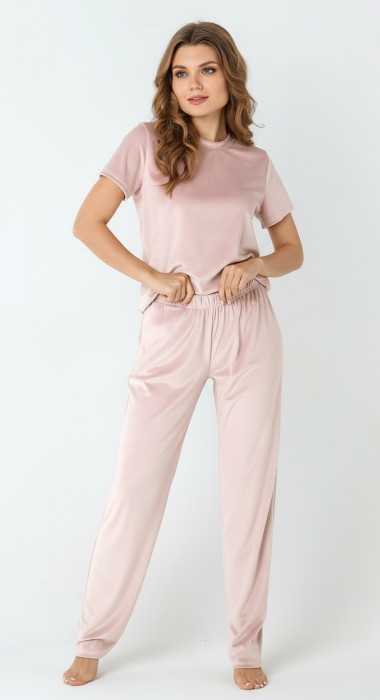 Костюм молодежный из трикотажного полотна «велюр-стрейч», состоящий из футболки и брюк. Футболка - классического покроя, с короткими втачными рукавами и горловиной овальной формы, обработанной втачной бейкой. Брюки – длинные, свободного покроя, с эластичной тесьмой по талии.