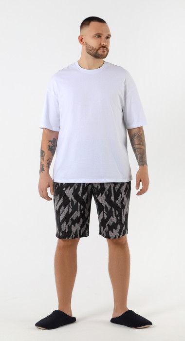 Шорты мужские из трикотажного полотна "кулирка" с набивным рисунком, удлиненные, на притачном поясе с эластичной тесьмой внутри, с карманами в боковых швах, входы в которые окантованы основным материалом.